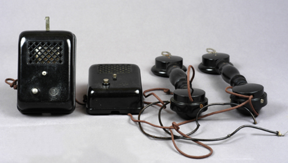 huistelefoon van bakeliet, dubbel stel met schakelka...