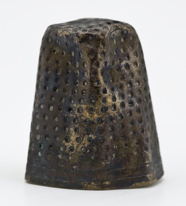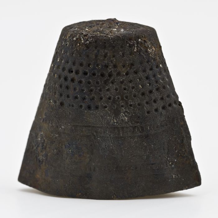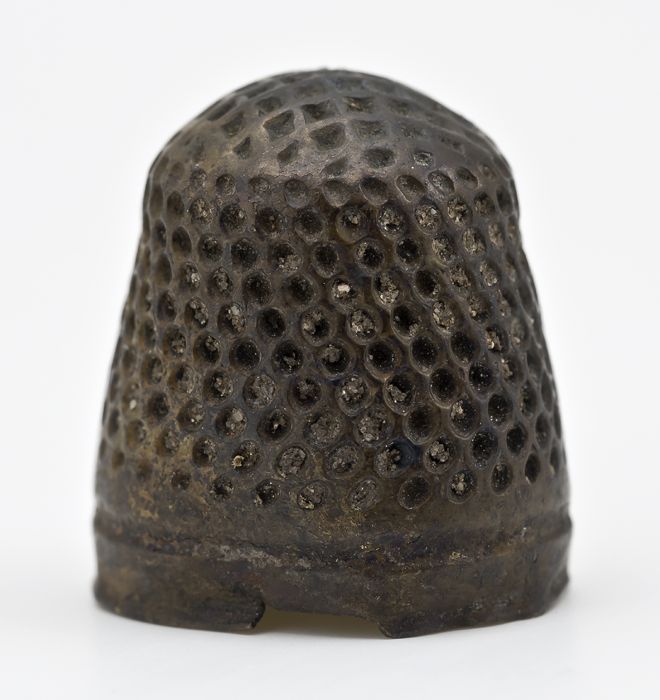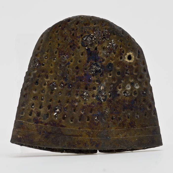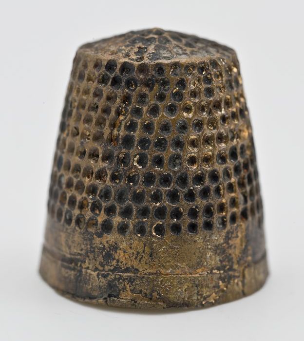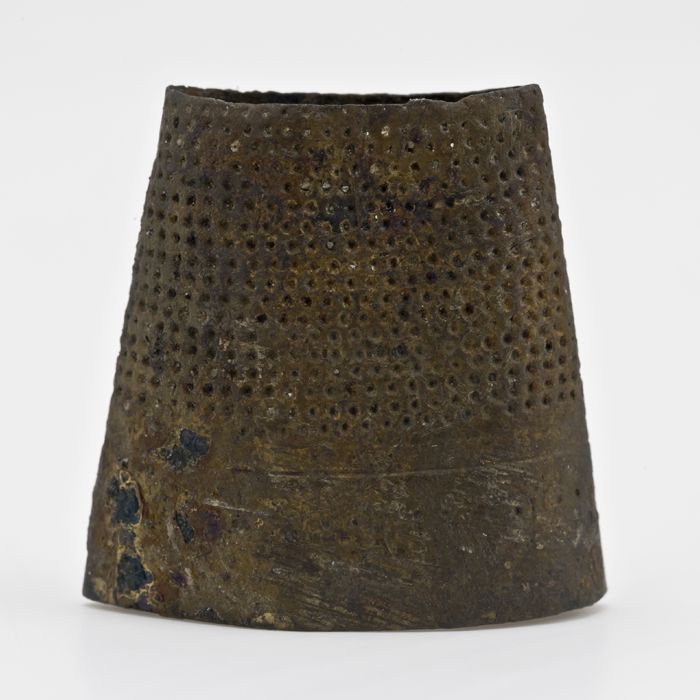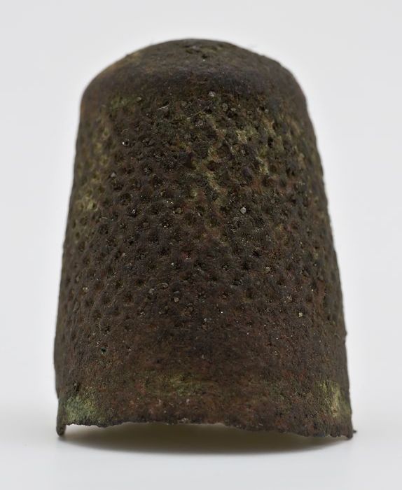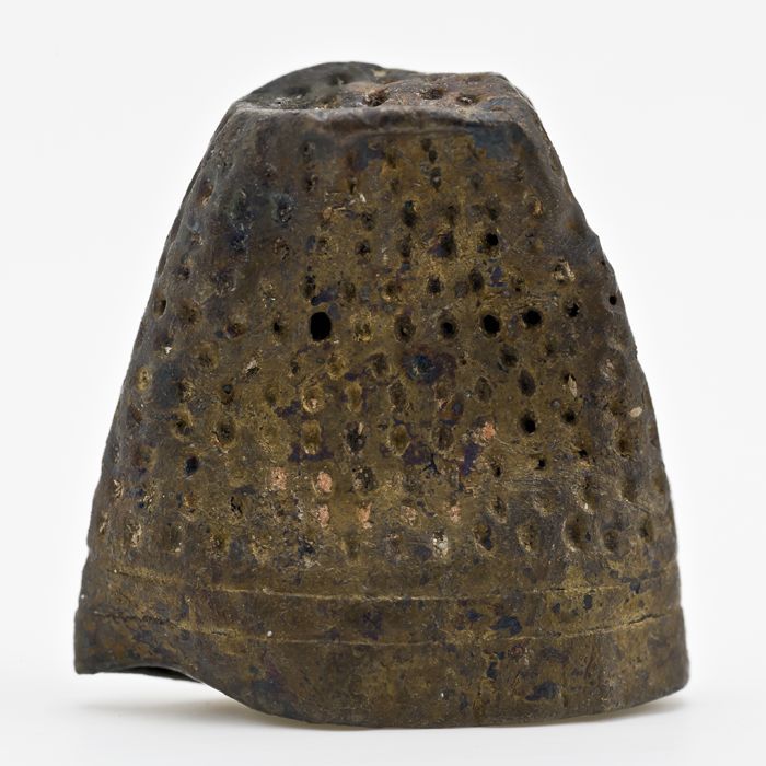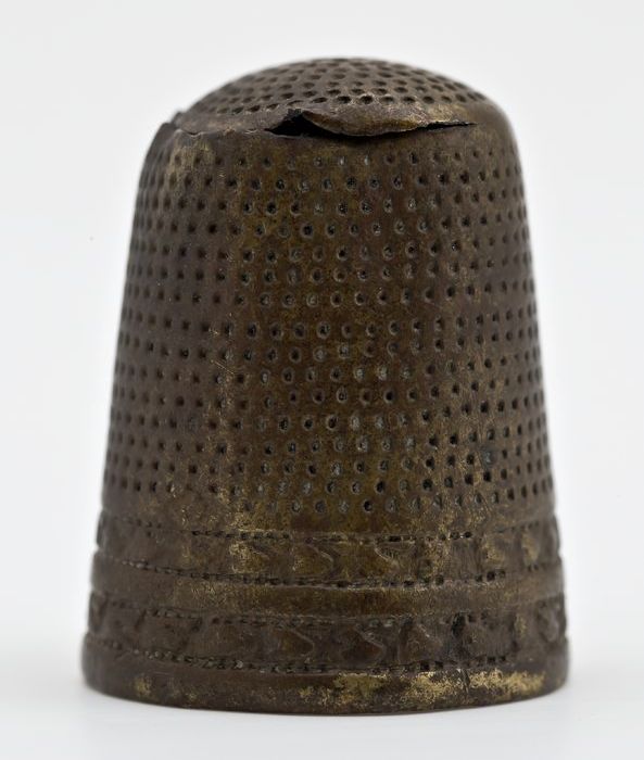 Koperen gegoten vingerhoed met groef en putjes in li...