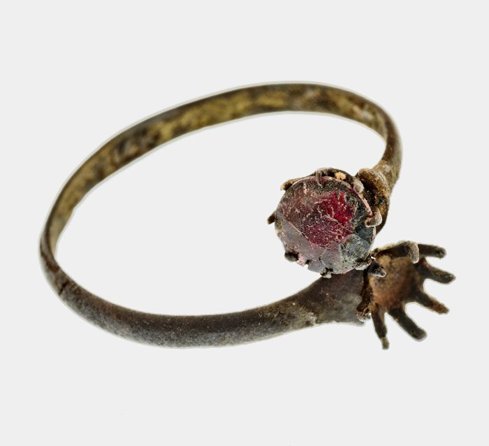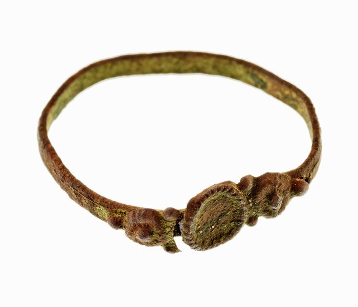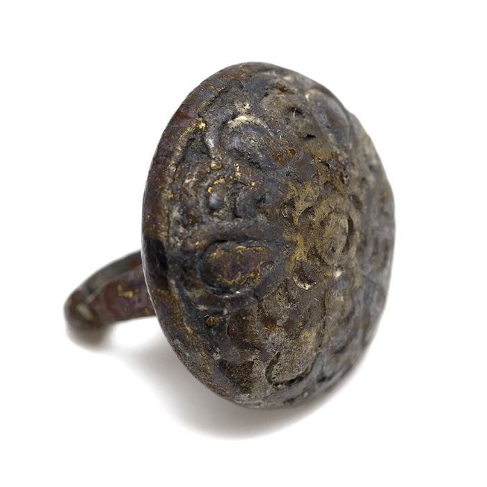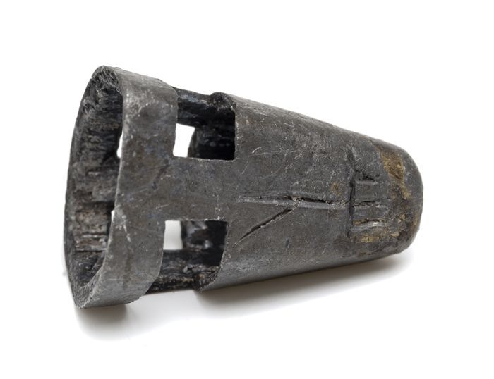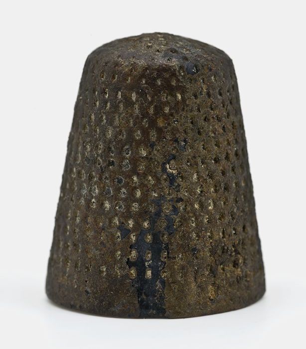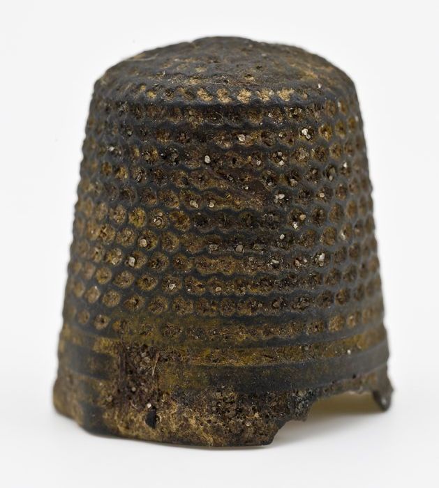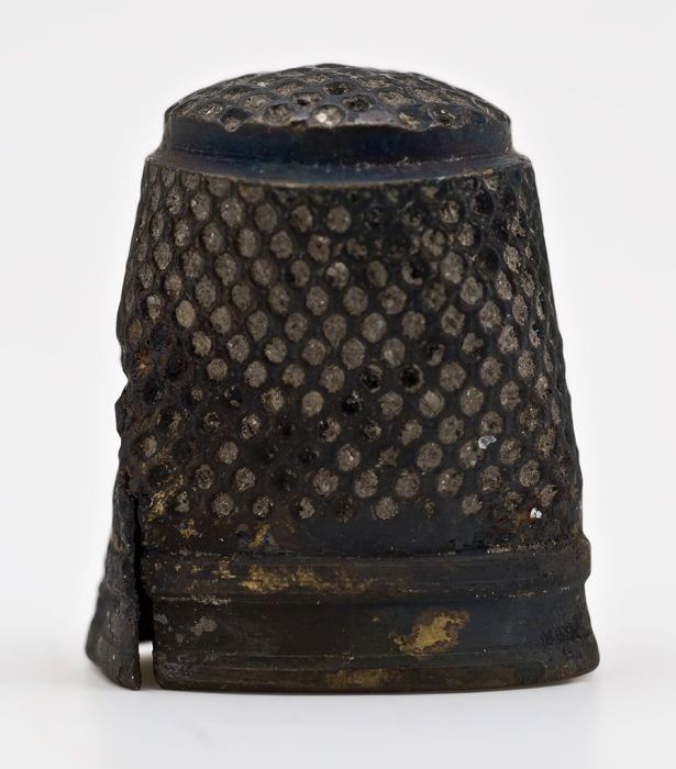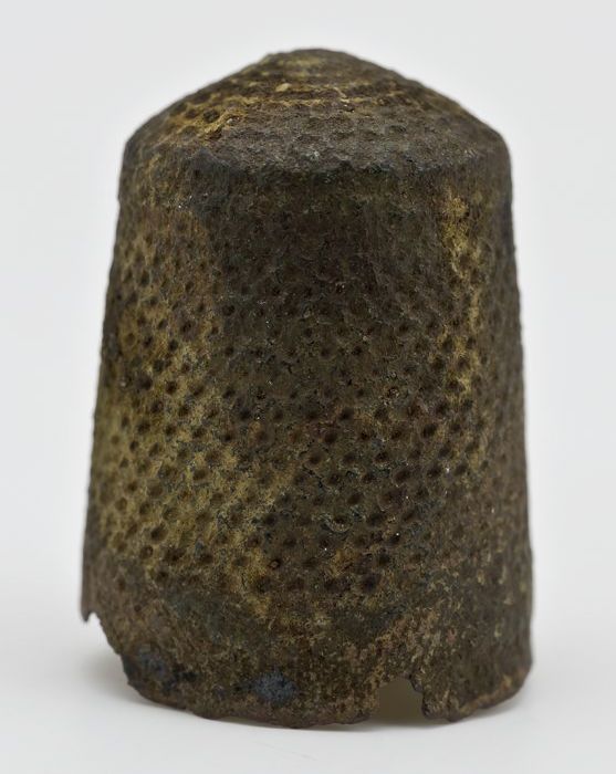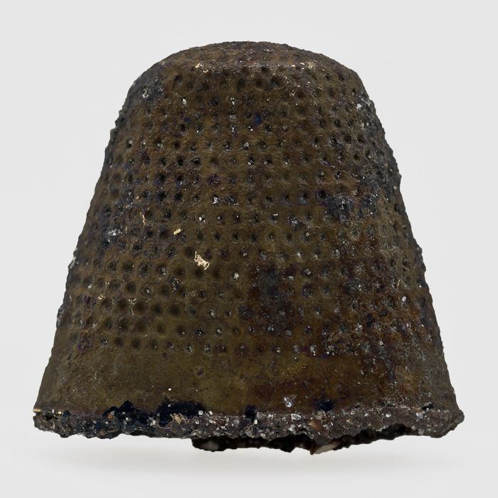 Koperen gegoten vingerhoed met groef en putjes in li...