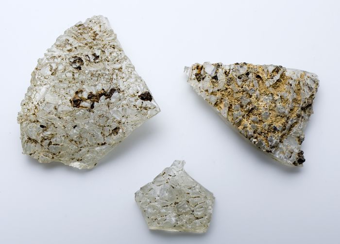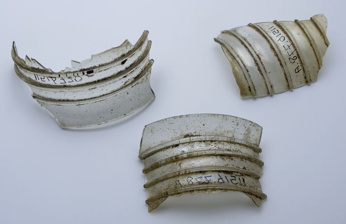 Drie fragmenten van wand van beker (?) in ijsglas