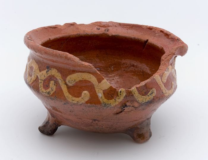 Aardewerk kookpot, versierd met gele slingers en str...