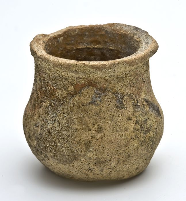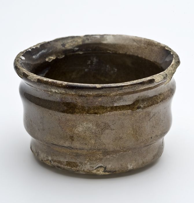 Aardewerk zalfpot met twee insnoeringen, laag en wij...