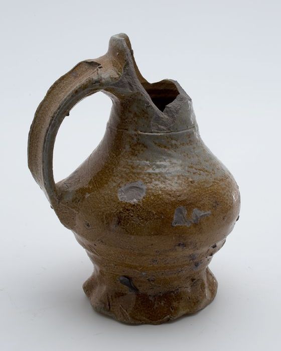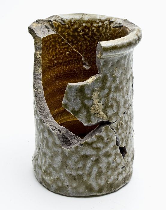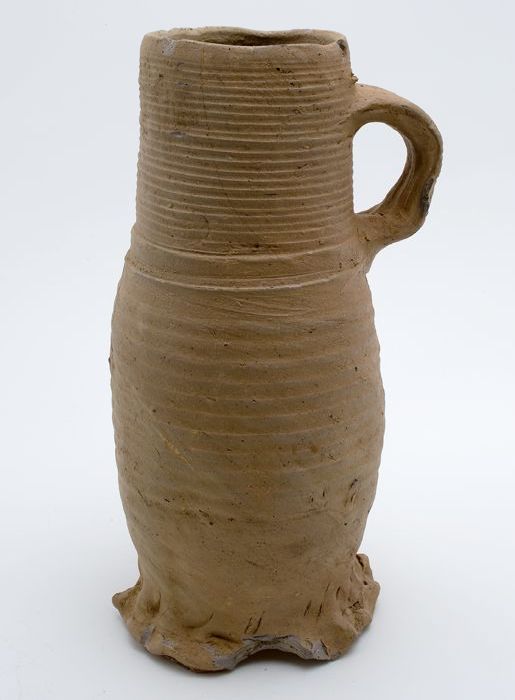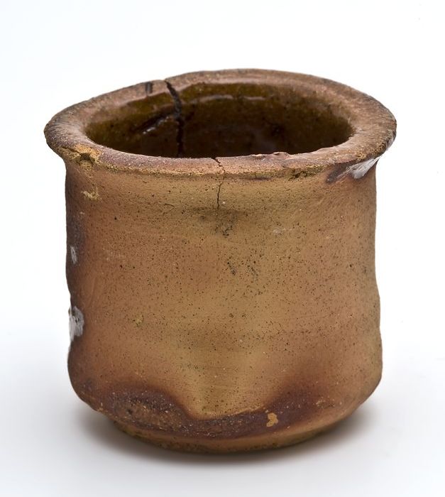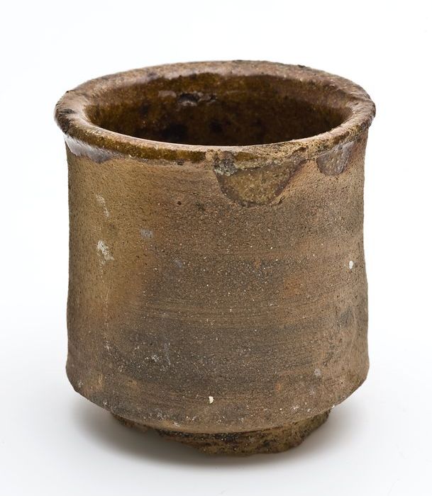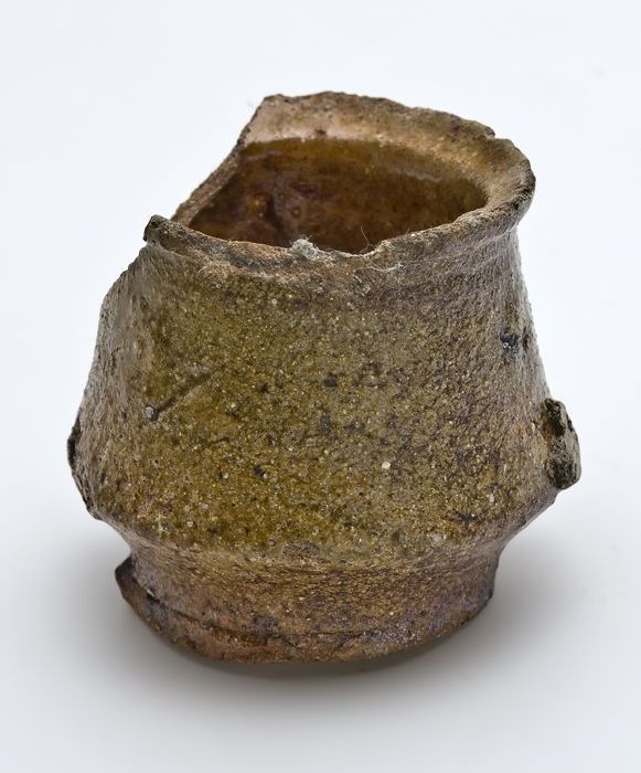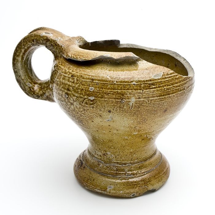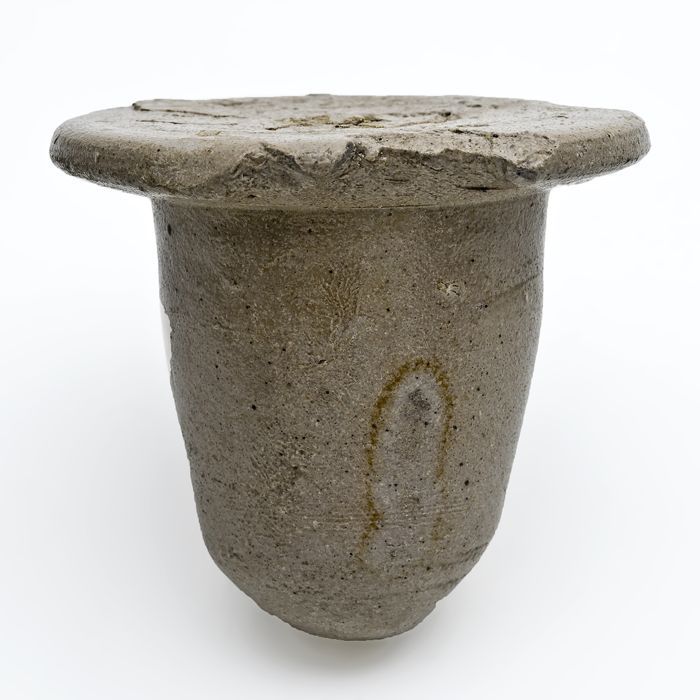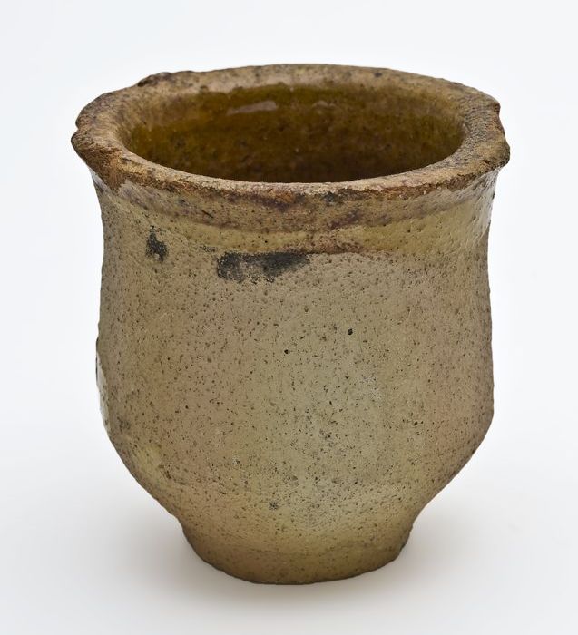 Mosterdpot of drinkbeker op geknepen voet, steengoed