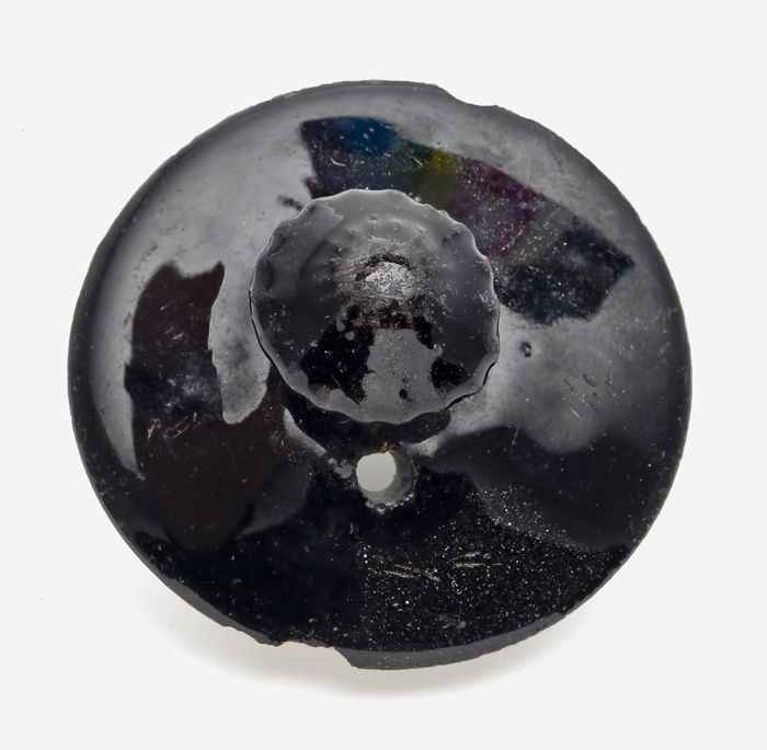 Klein deksel van zwart aardewerk, bloemvormige knop
