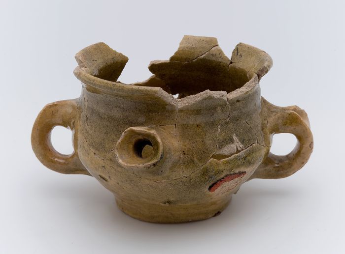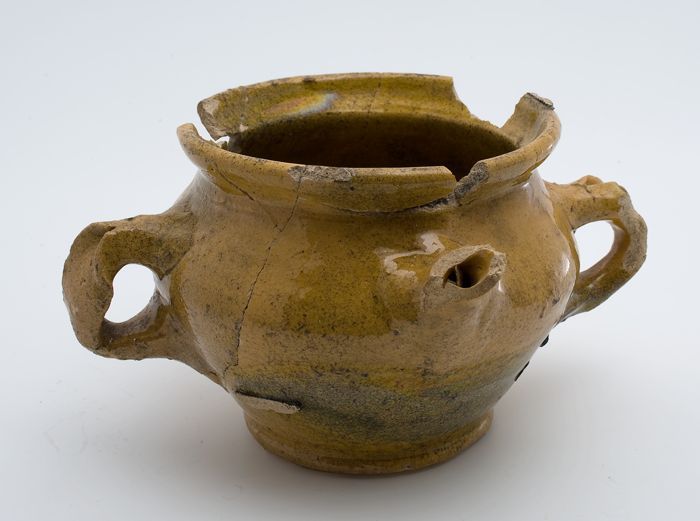 Aardewerk kamerpot met worstoor op standvlak met ziel