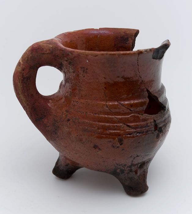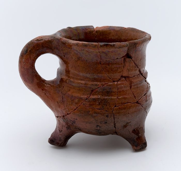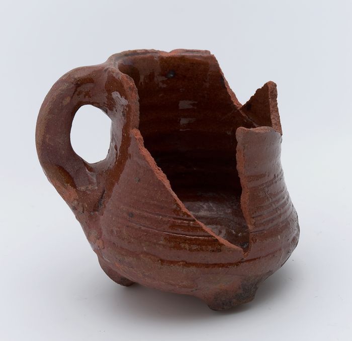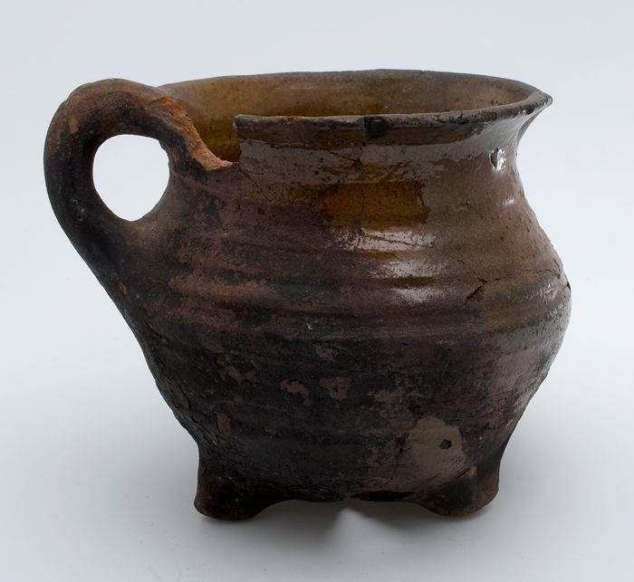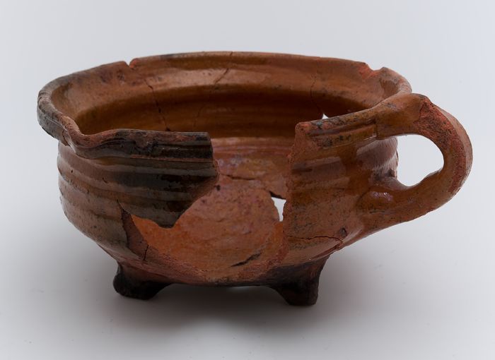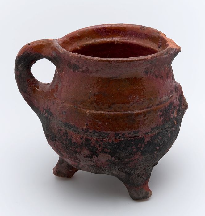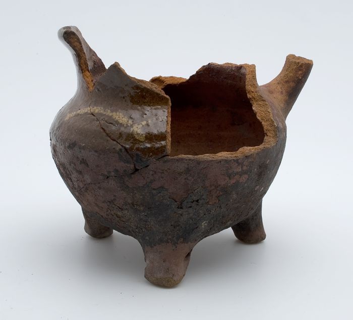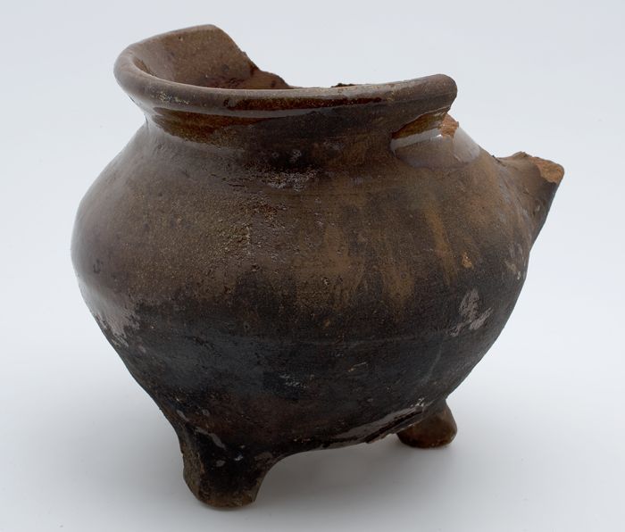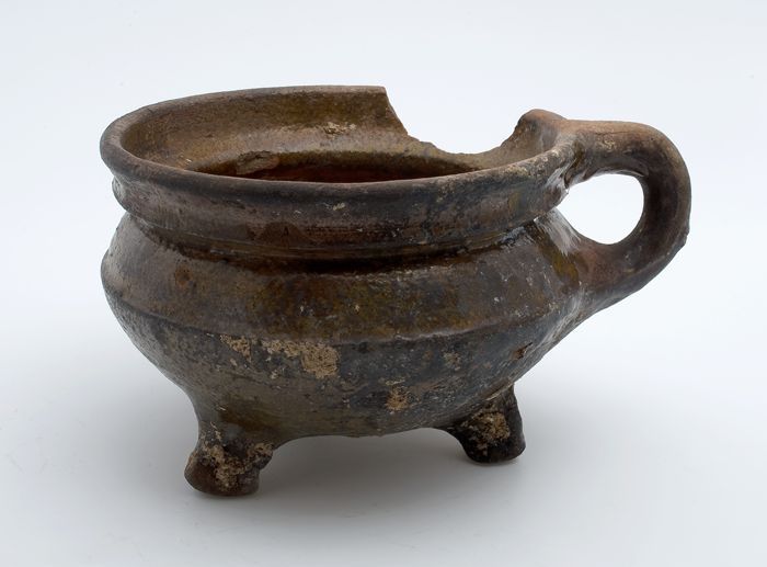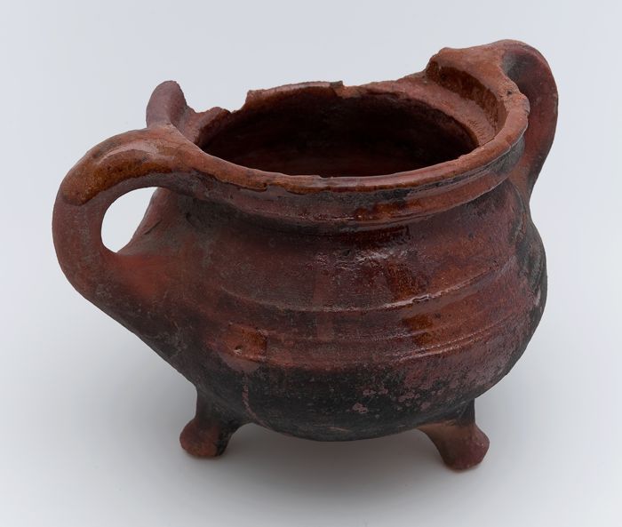 Aardewerk kookpot, met één oor, op drie poten