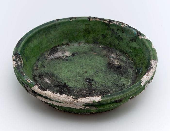Aardewerk bak, rond, laag model, groen geglazuurd