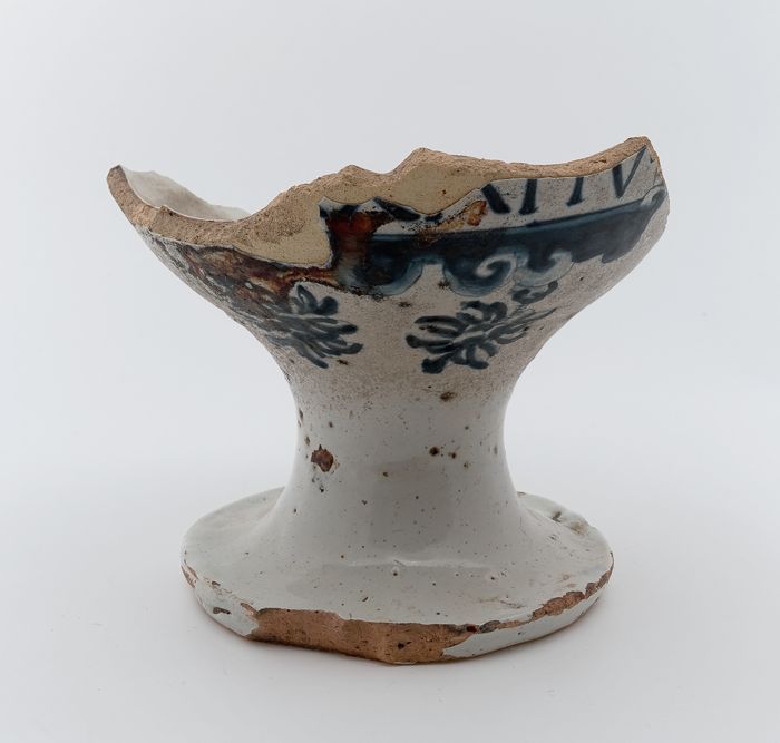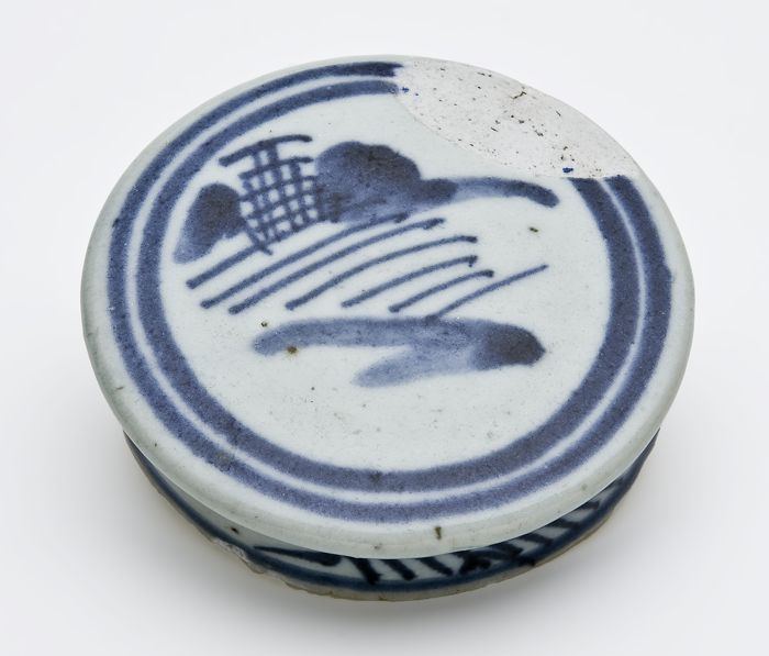 Fragment aardewerk apothekerspot, wit met blauwe dec...
