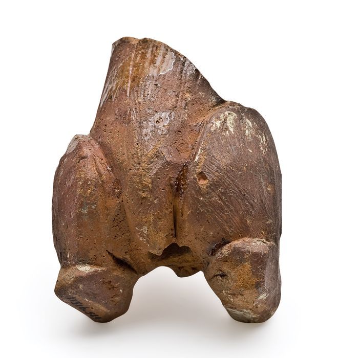 Rood aardewerken onderkant van zittend beest (aap of...
