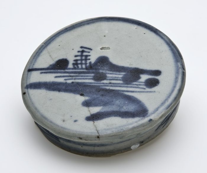Aardewerk faience kwispedoor, decor in blauw en wit