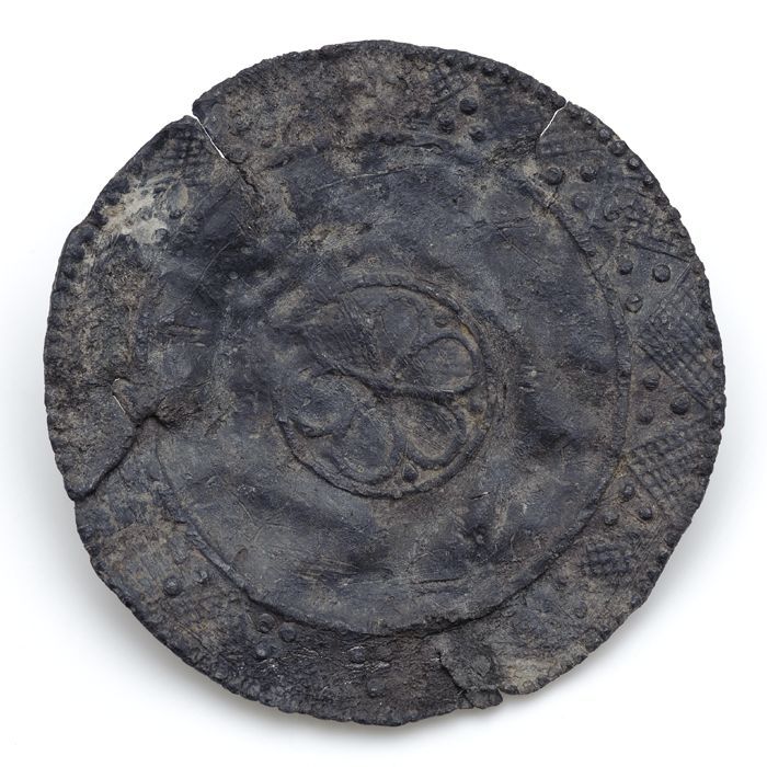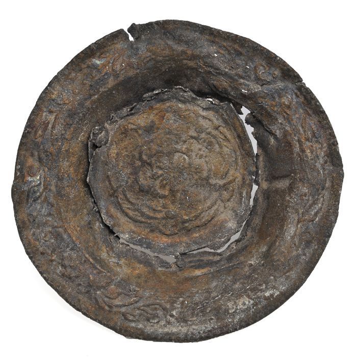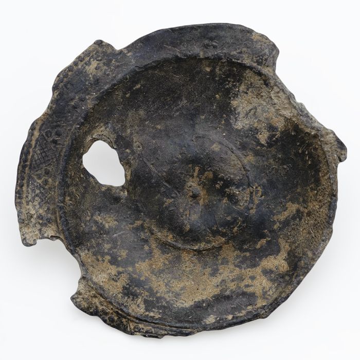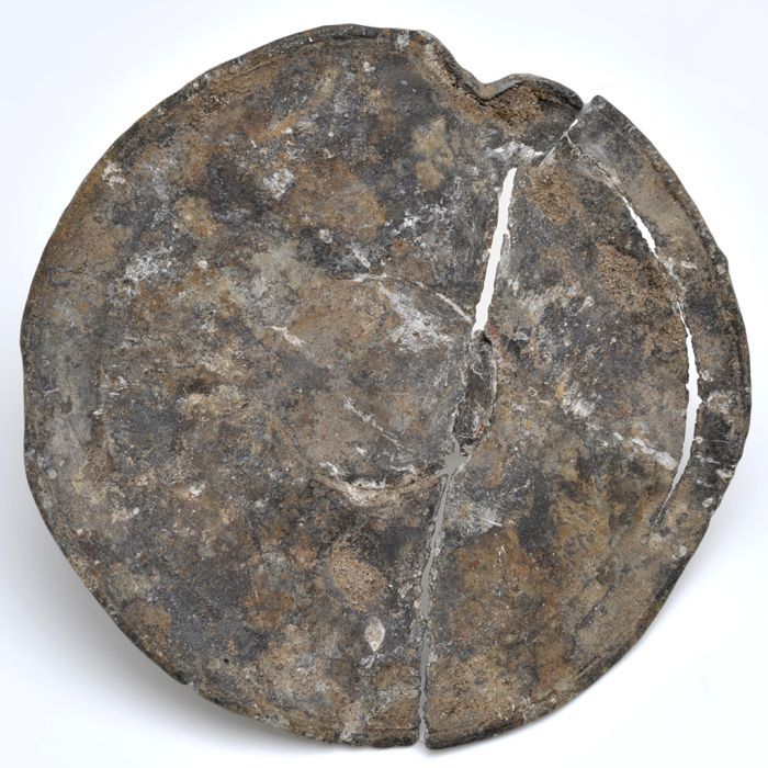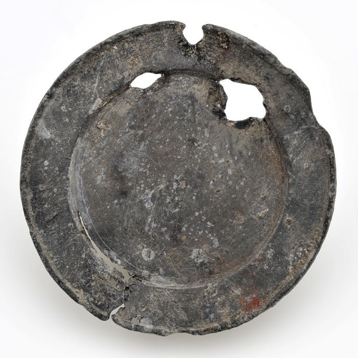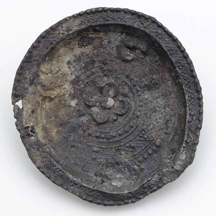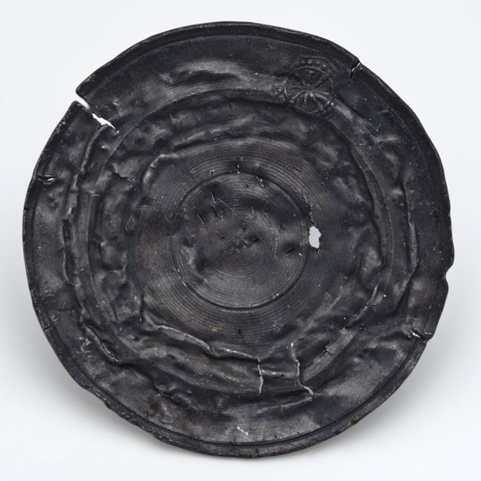 Schotel op standvinnen, ingekrast rozet in de spiegel