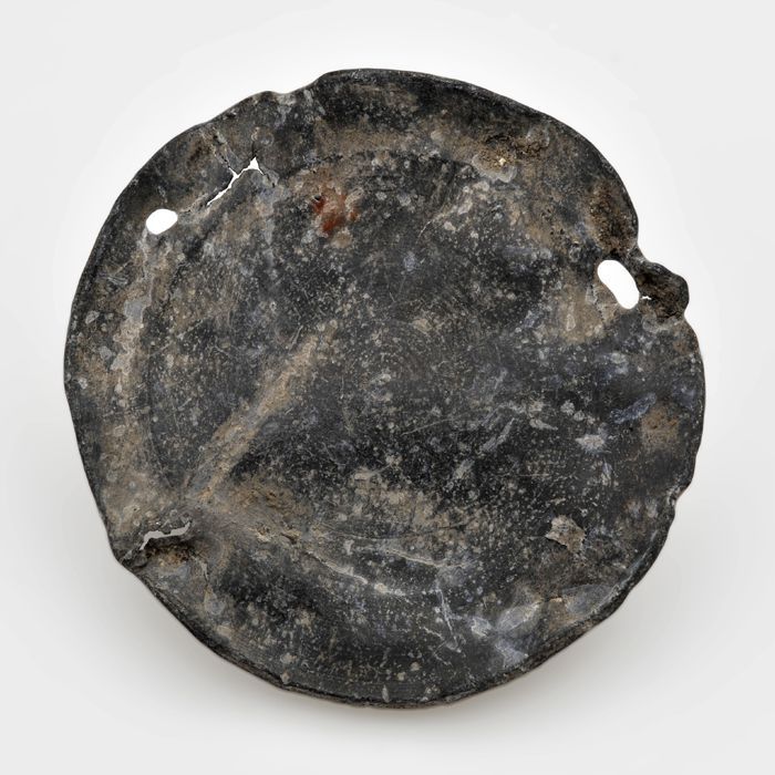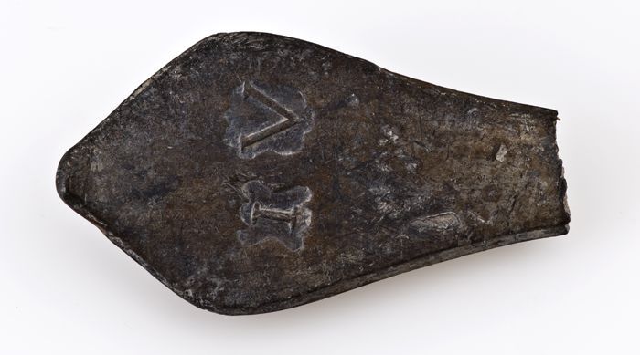 Plat stuk leisteen met aan één zijde ingekraste rech...