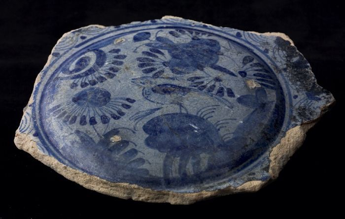 Majolica pannenkoekenschotel met 'vogel in Chinese t...
