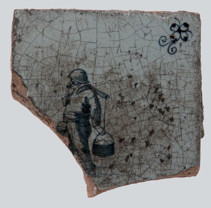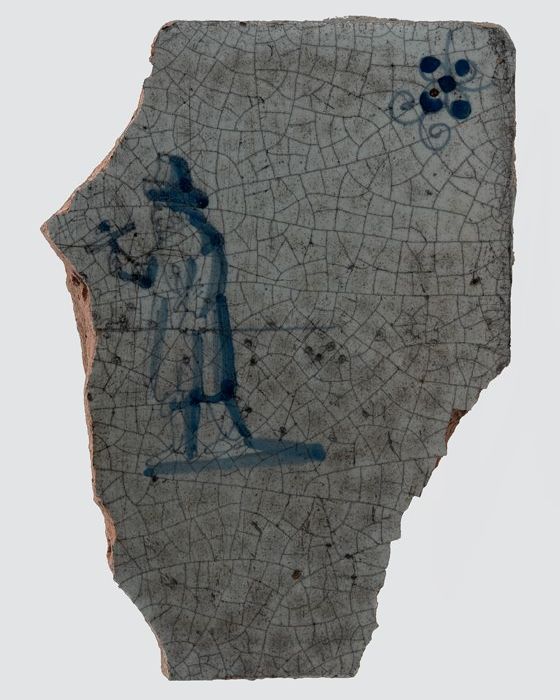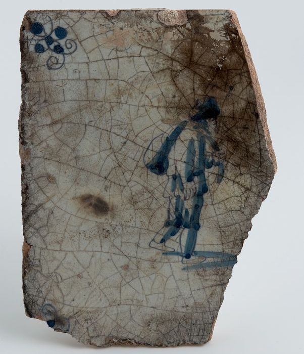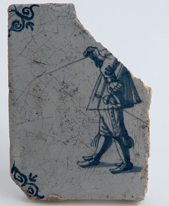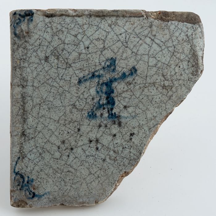Fragment figuurtegel, blauw, krijgsman, hoekmotief o...