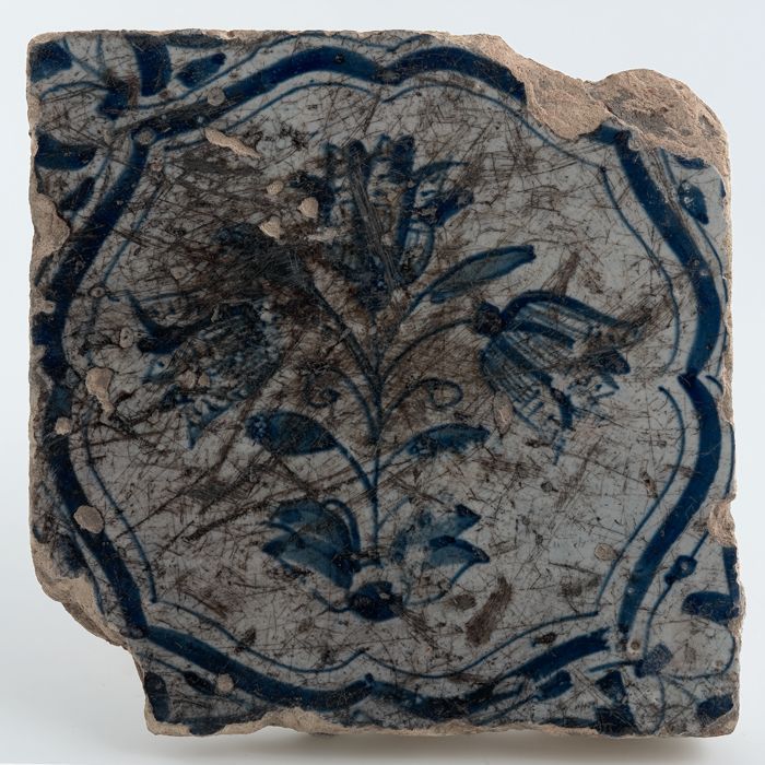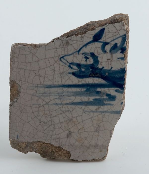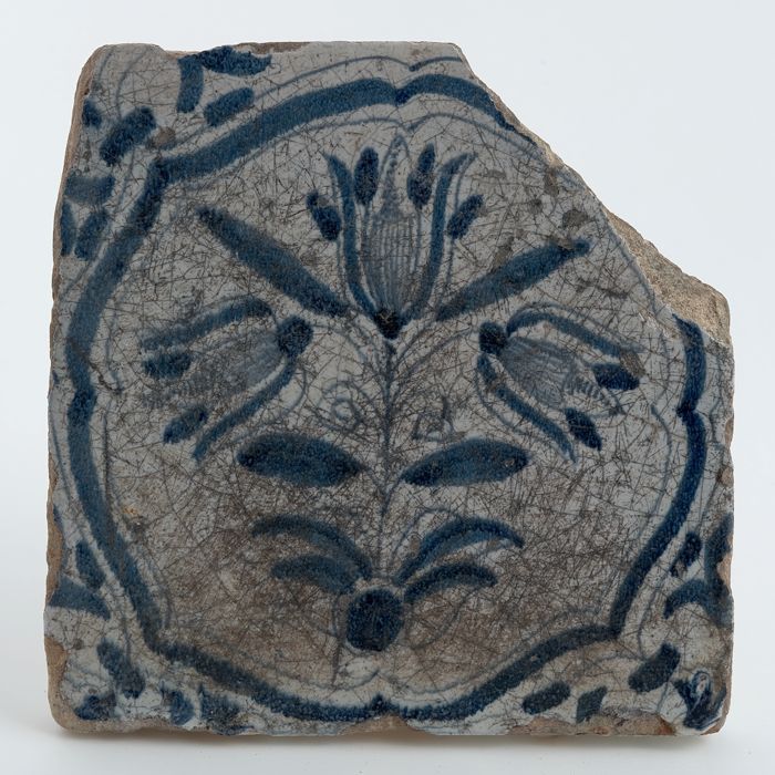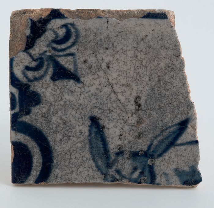 Fragment tegel, blauw op wit, met centraal monochroo...