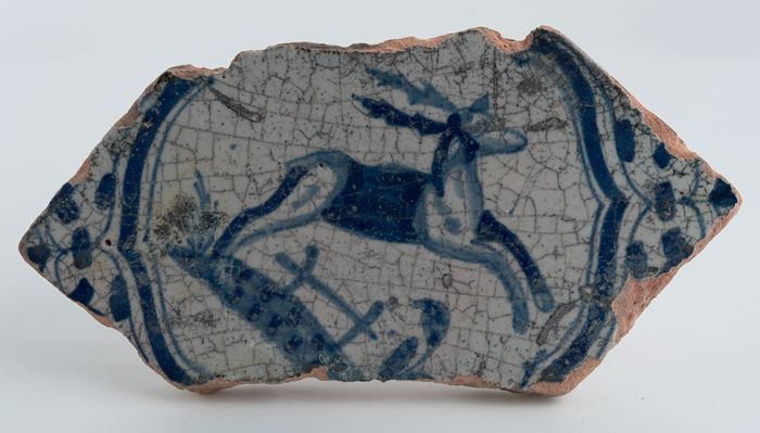 Fragment tegel met monochroom blauw hoefdier, hoekmo...