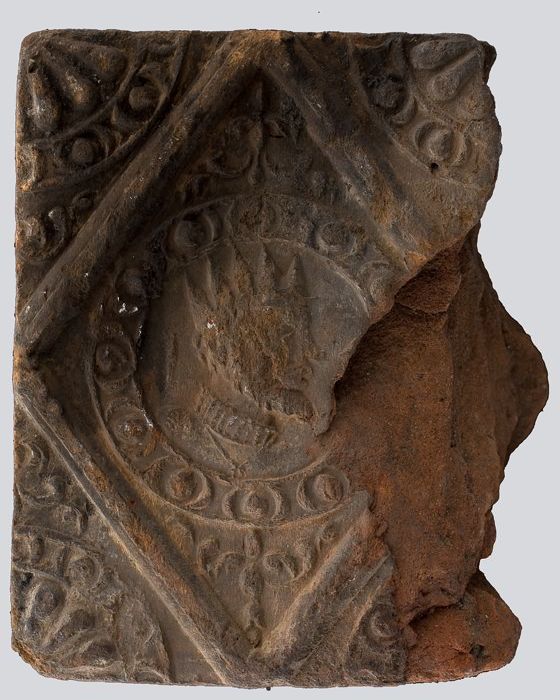 Fragment tegel met accoladeomlijsting en centraal mo...