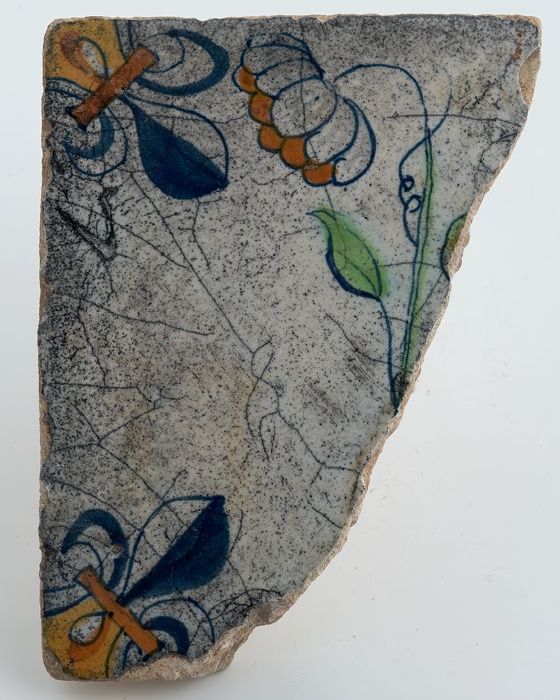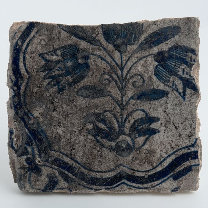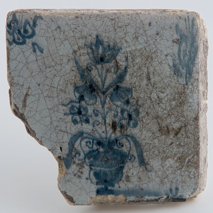 Fragment bloemtegel, bloem op grondje, hoekmotief le...