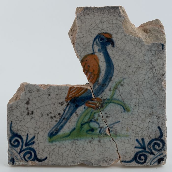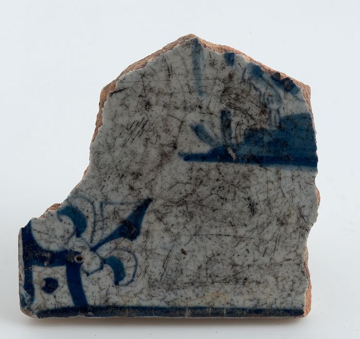 Fragment figuurtegel, blauw, zakkendrager, hoekmotie...