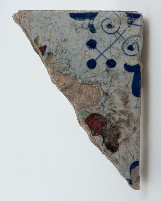 Fragment tegel met meerkleurig patroon, hoekmotief d...