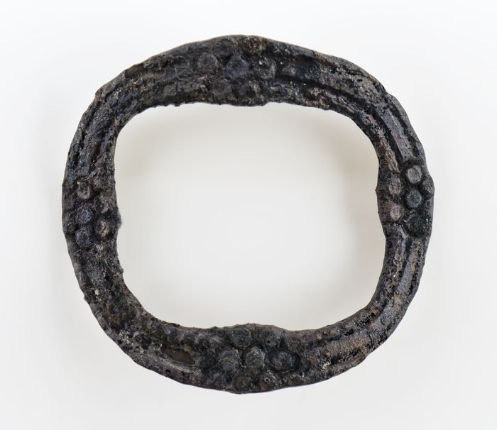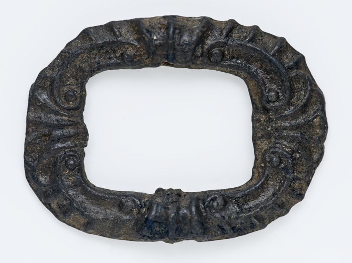 Kleine tinnen gesp zonder angel, versierde omlijsting