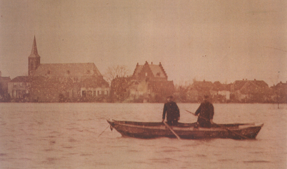 Zwart-wit foto van het hoogwater in de Oude Rijn bij...