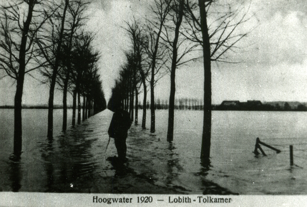 Reproductie van een zwart-wit foto van de overstromi...