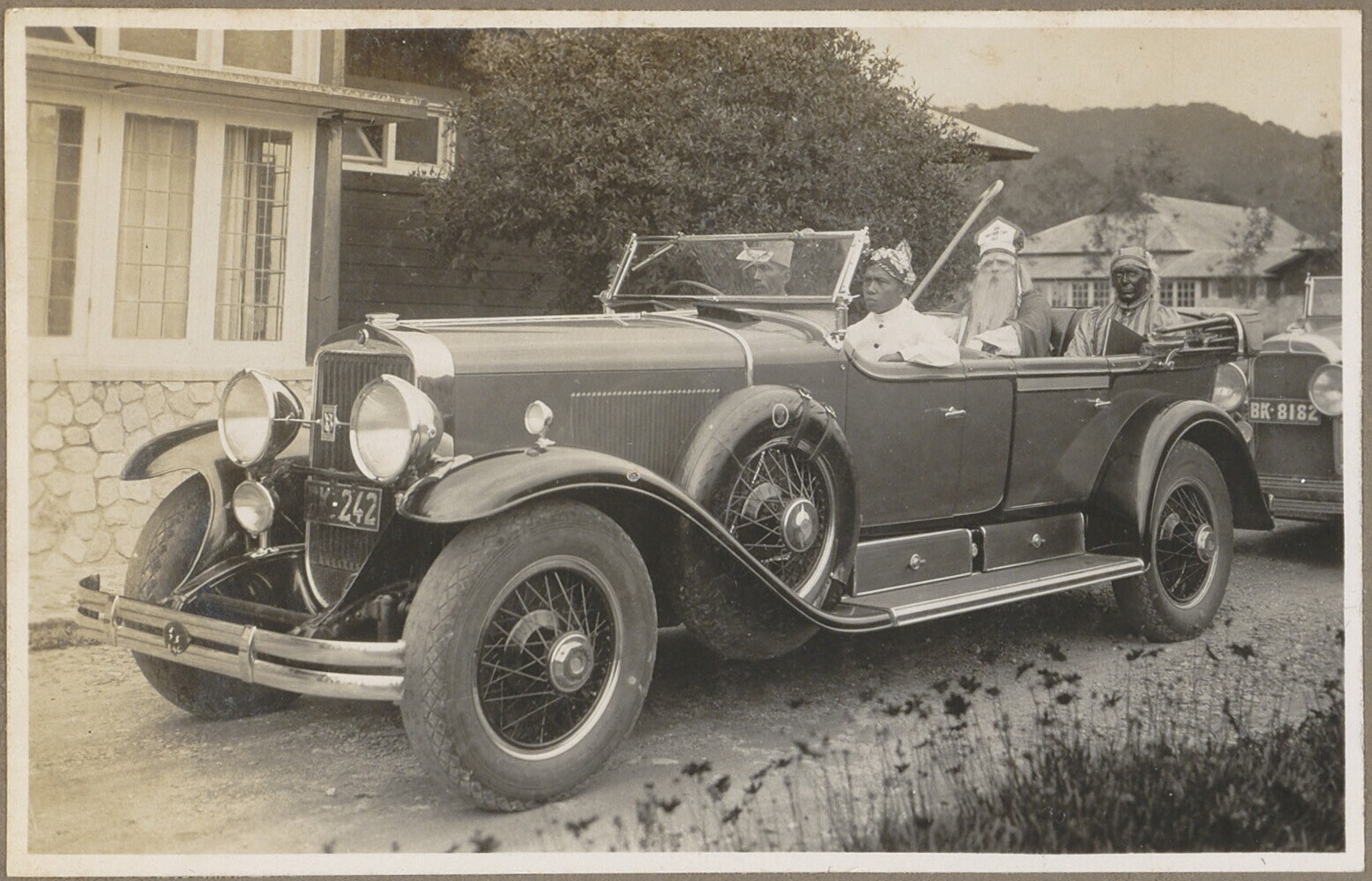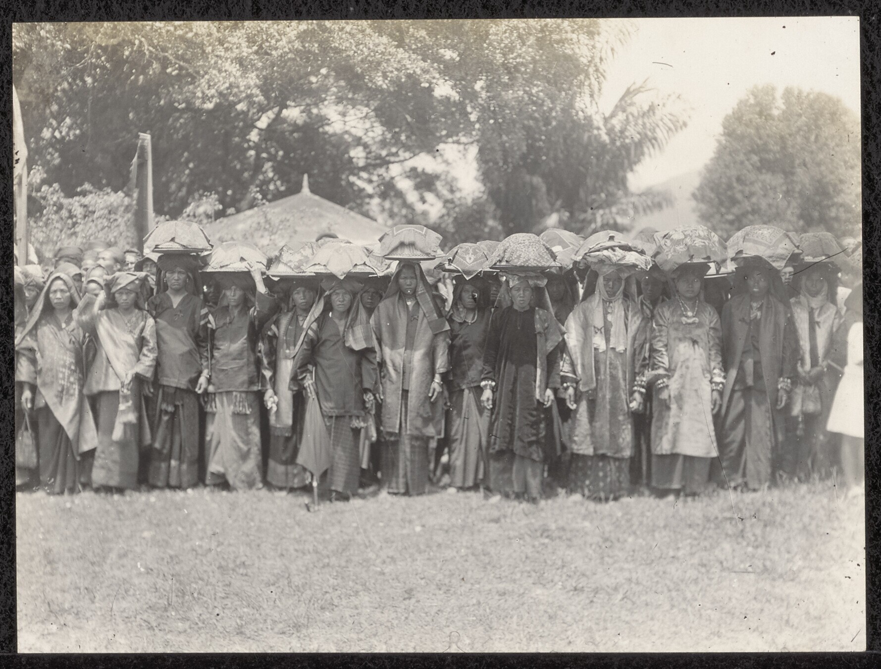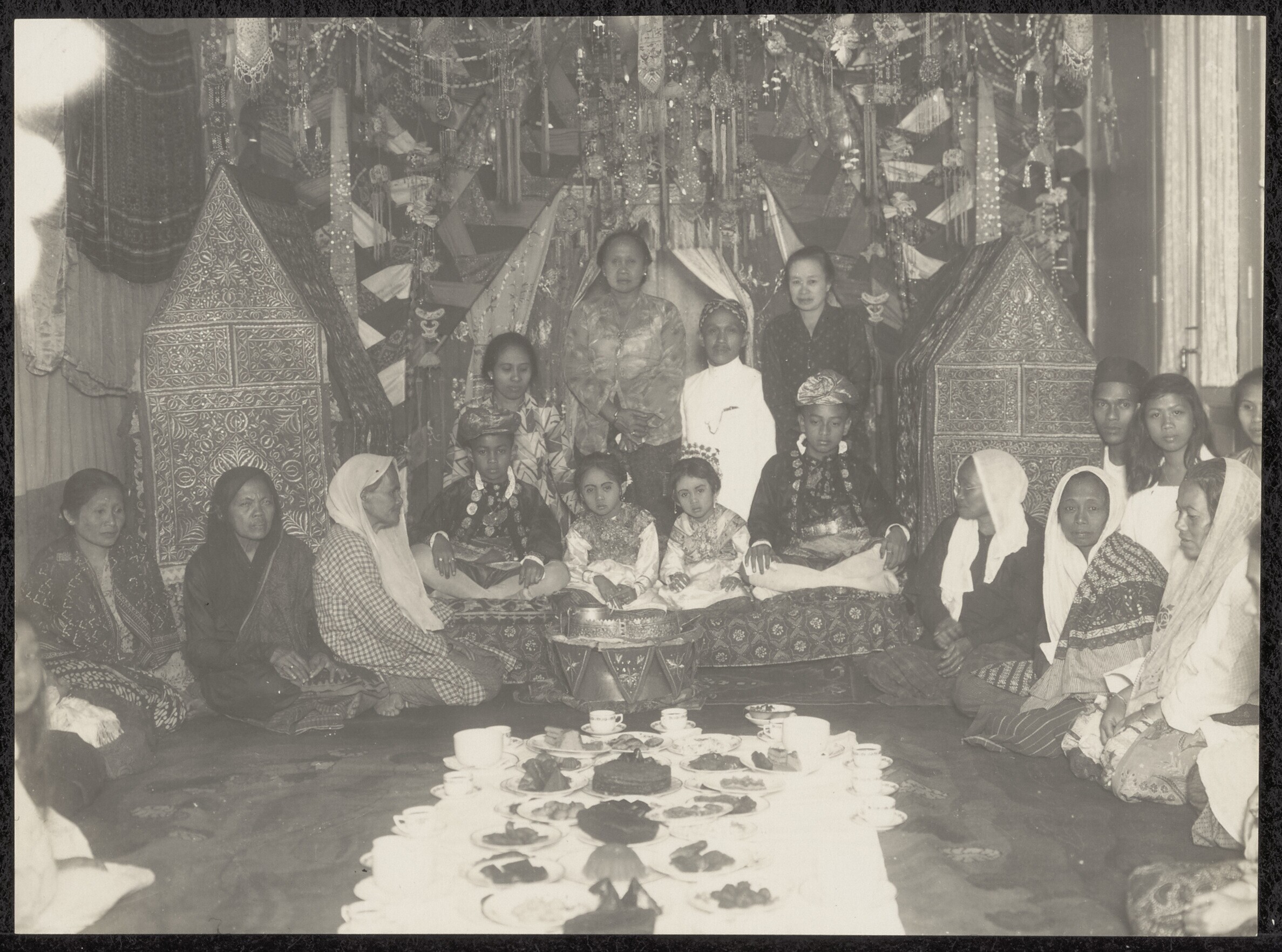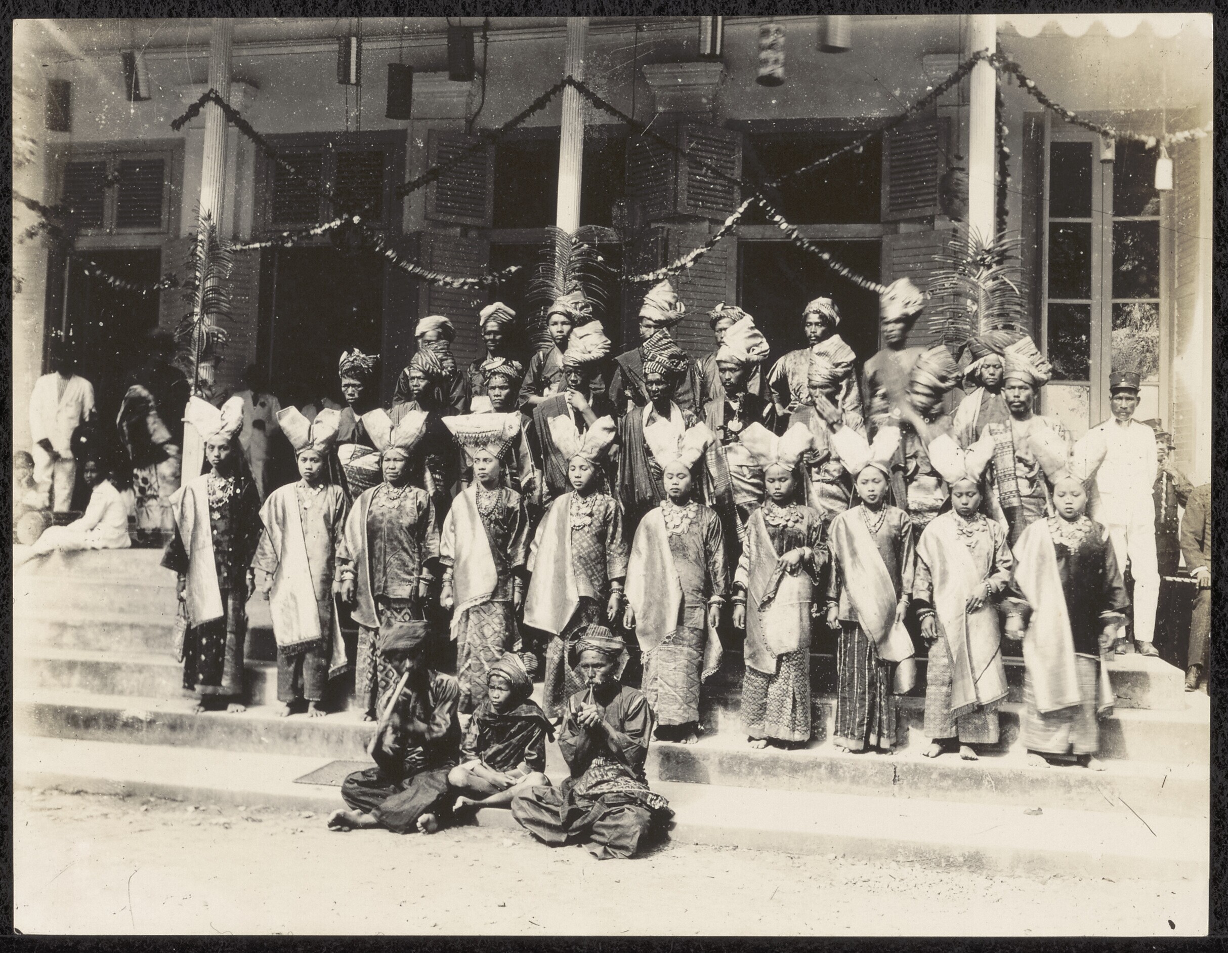 Portret van Padangs bruidspaar met gasten en orkest