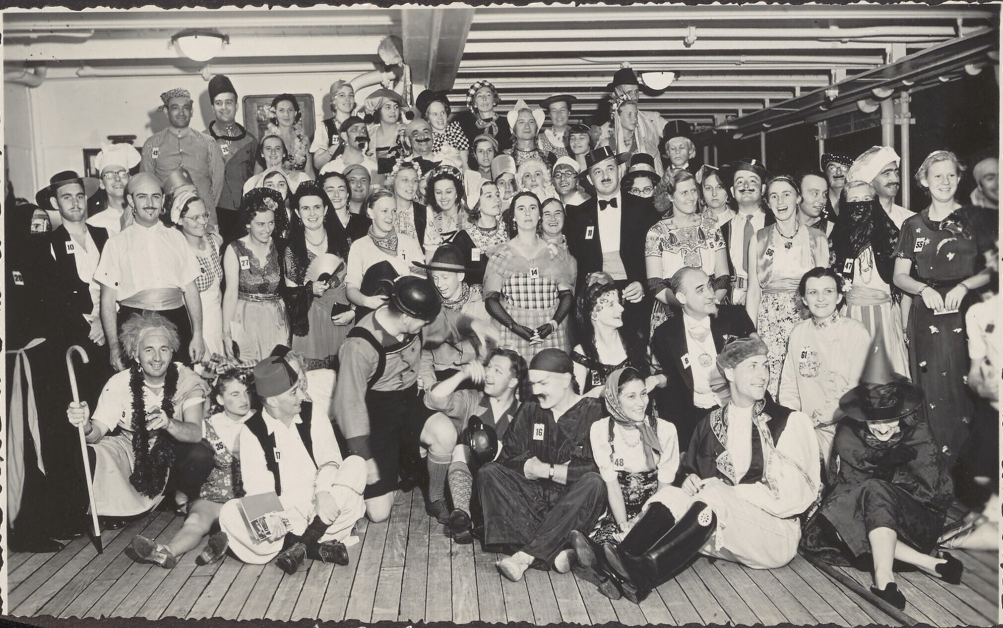 Groepsfoto van verklede passagiers aan boord van de ...