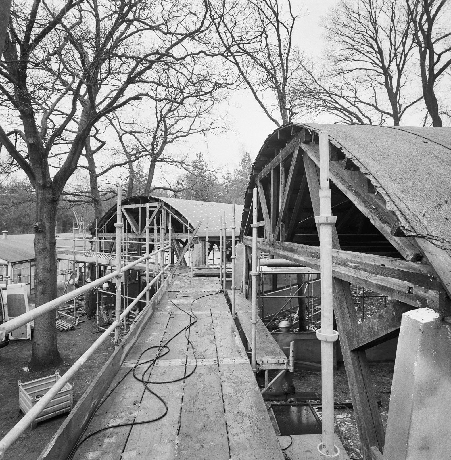 Overzicht werkplaatsen met dakconstructies, tijdens ...