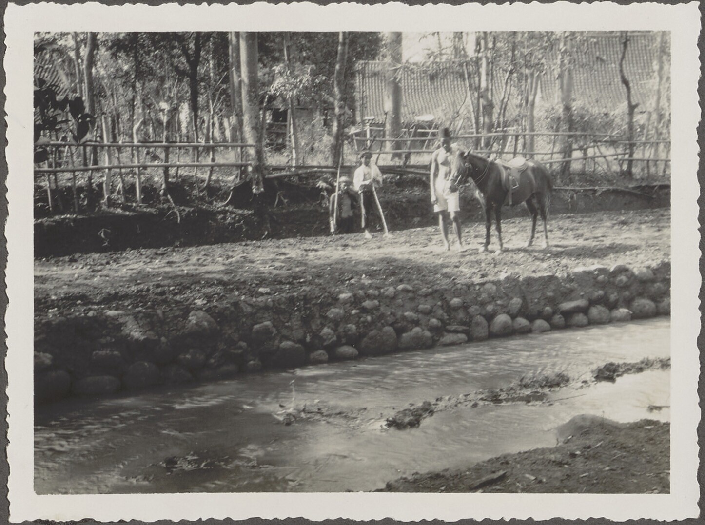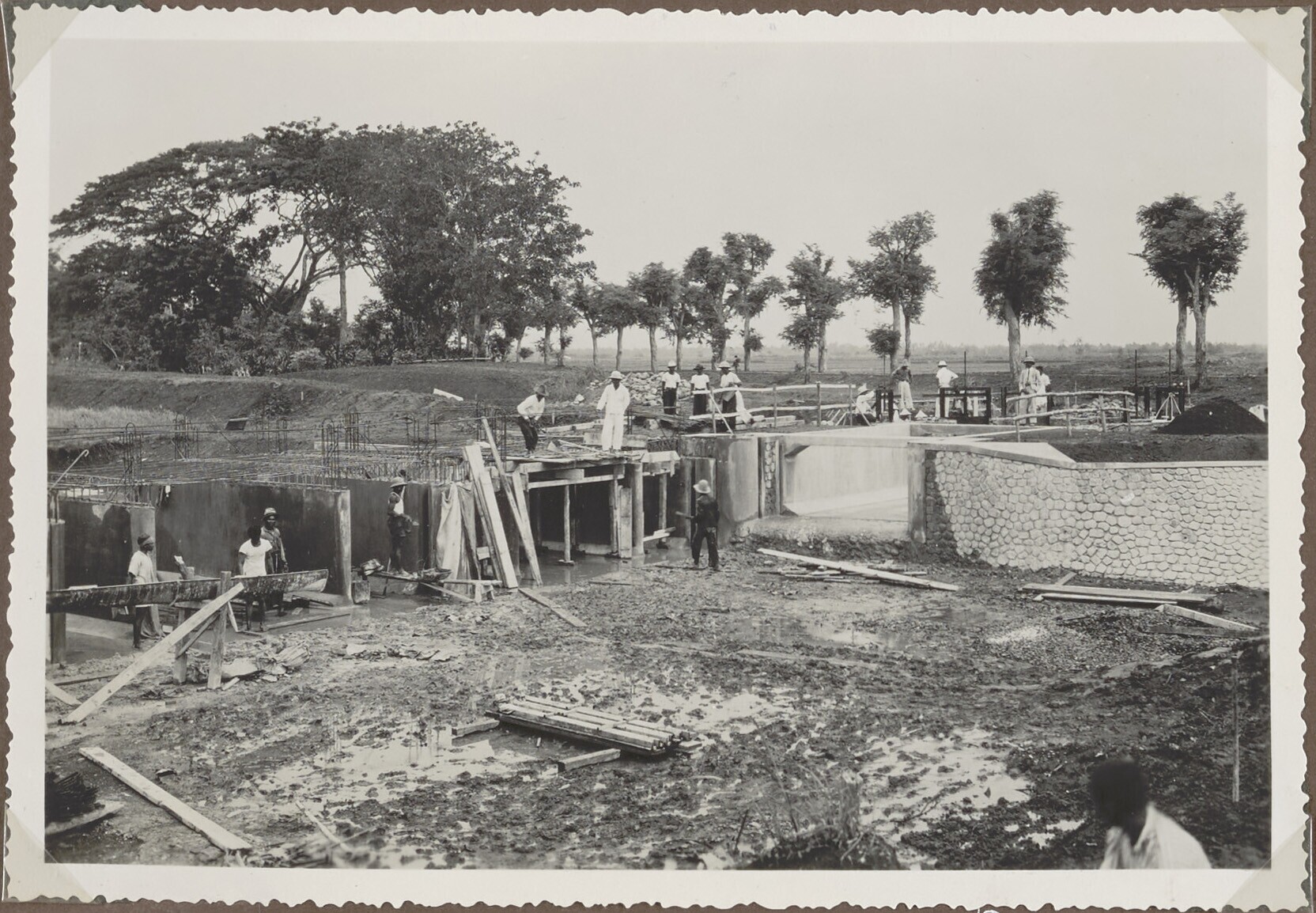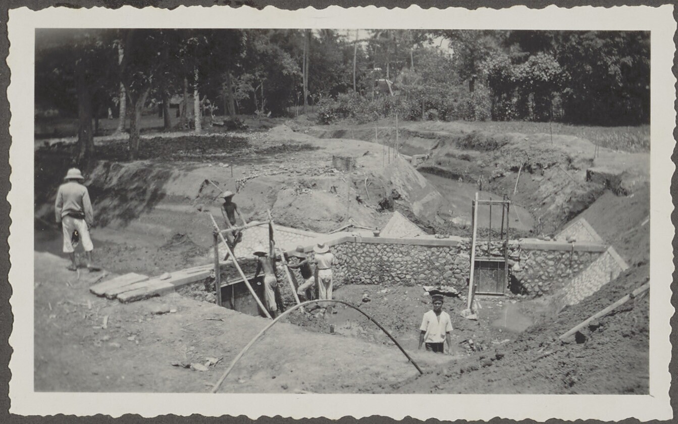 Twee Javaanse arbeiders werken aan een waterbouwkund...