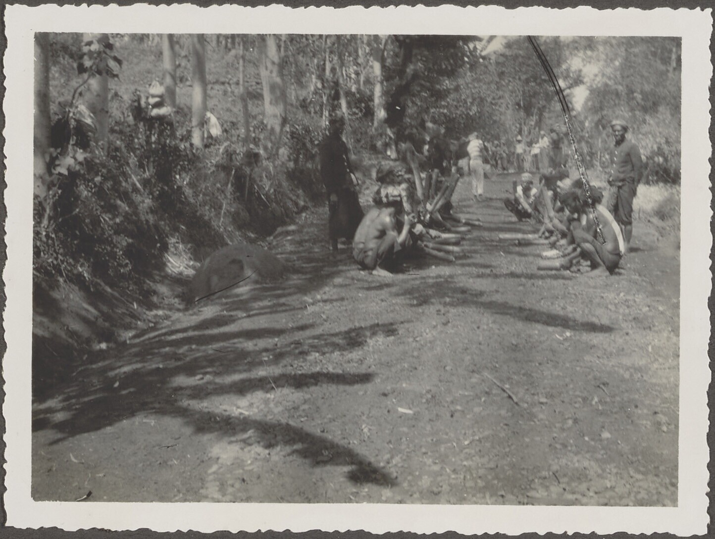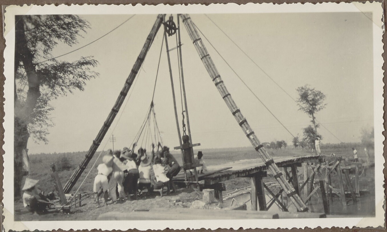 De Javaanse arbeiders heien met mankracht de pijlers...