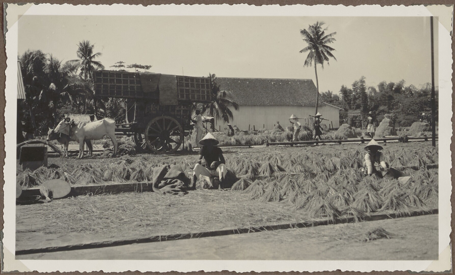 Enkele Javaanse mannen en vrouwen met de rijstoogst ...
