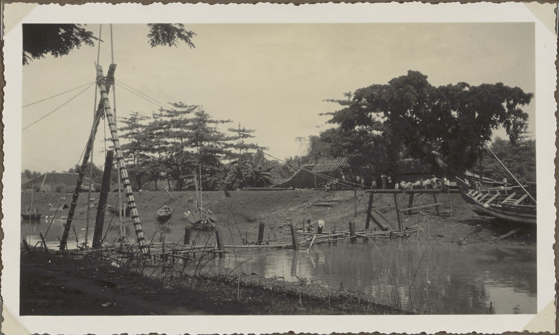 Gezicht op een brug, met houten pijlers en een bambo...