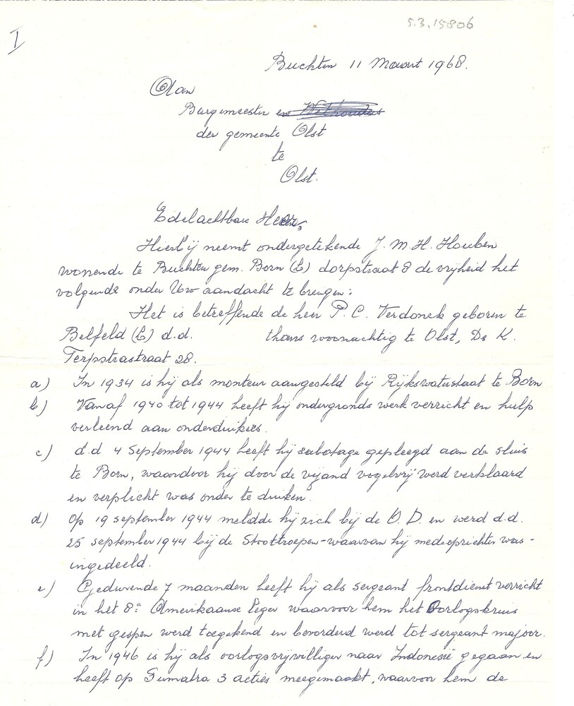 Brief van J.M.H Houben aan burgemeester van de gemee...