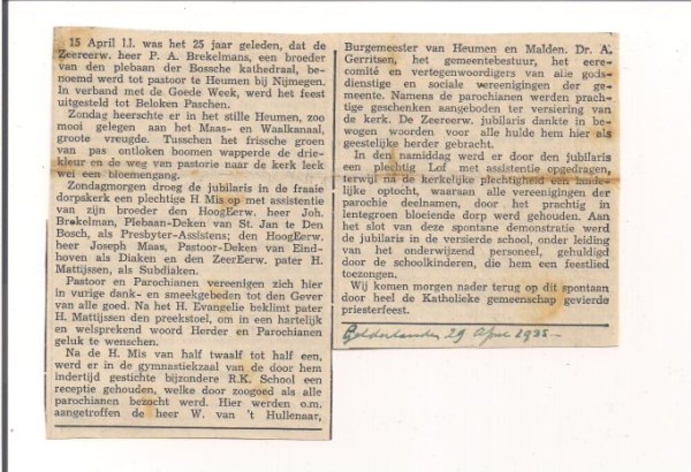 Pastoor Brekelmans 25 jaar pastoor in Heumen