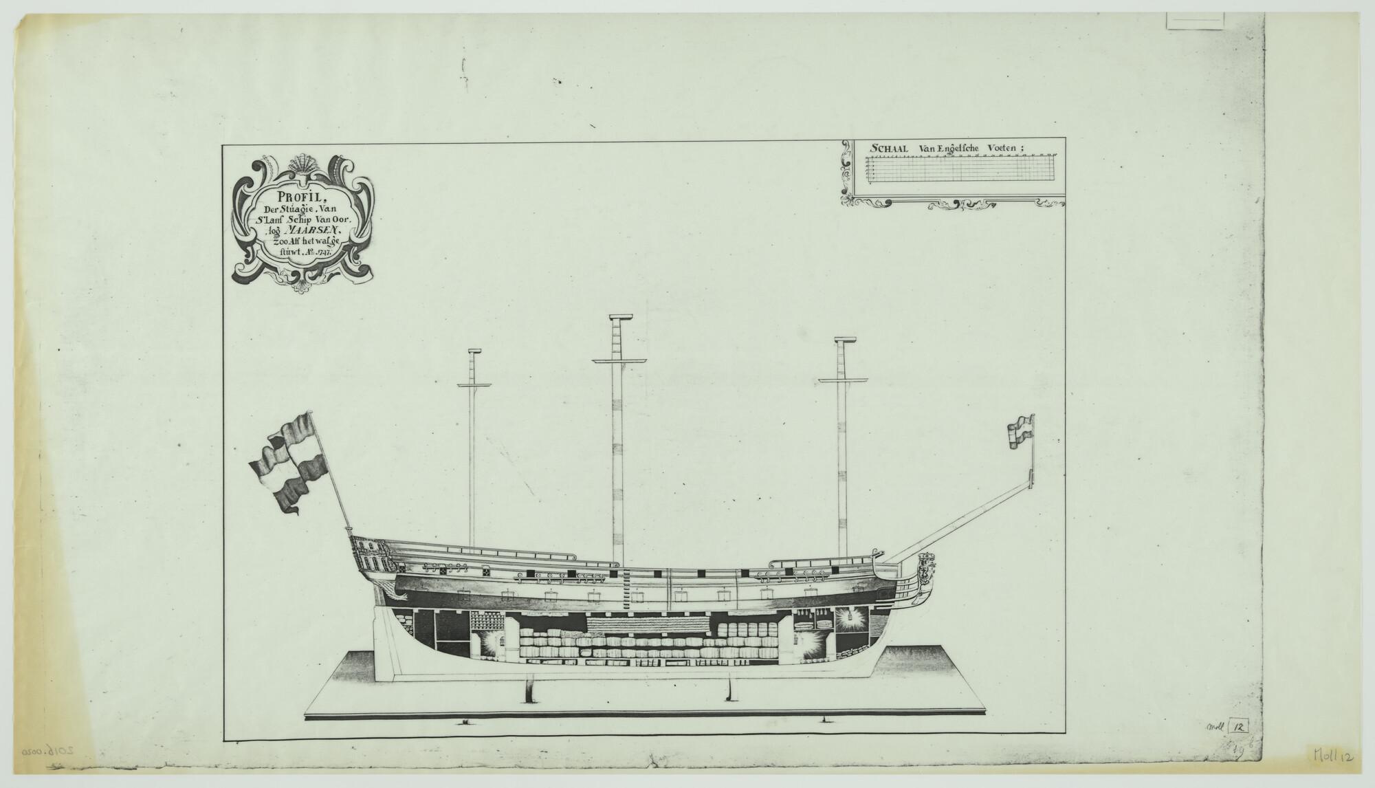 Opengewerkt zijaanzicht van 's Lands schip van oorlo...