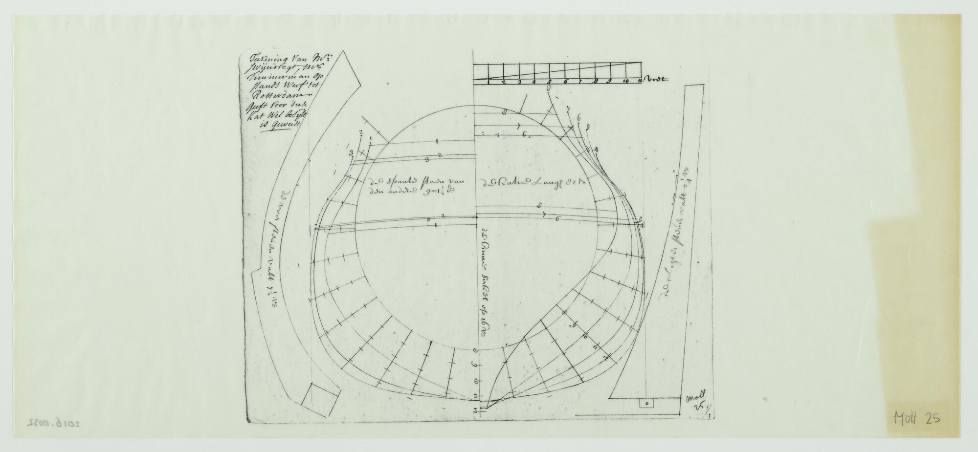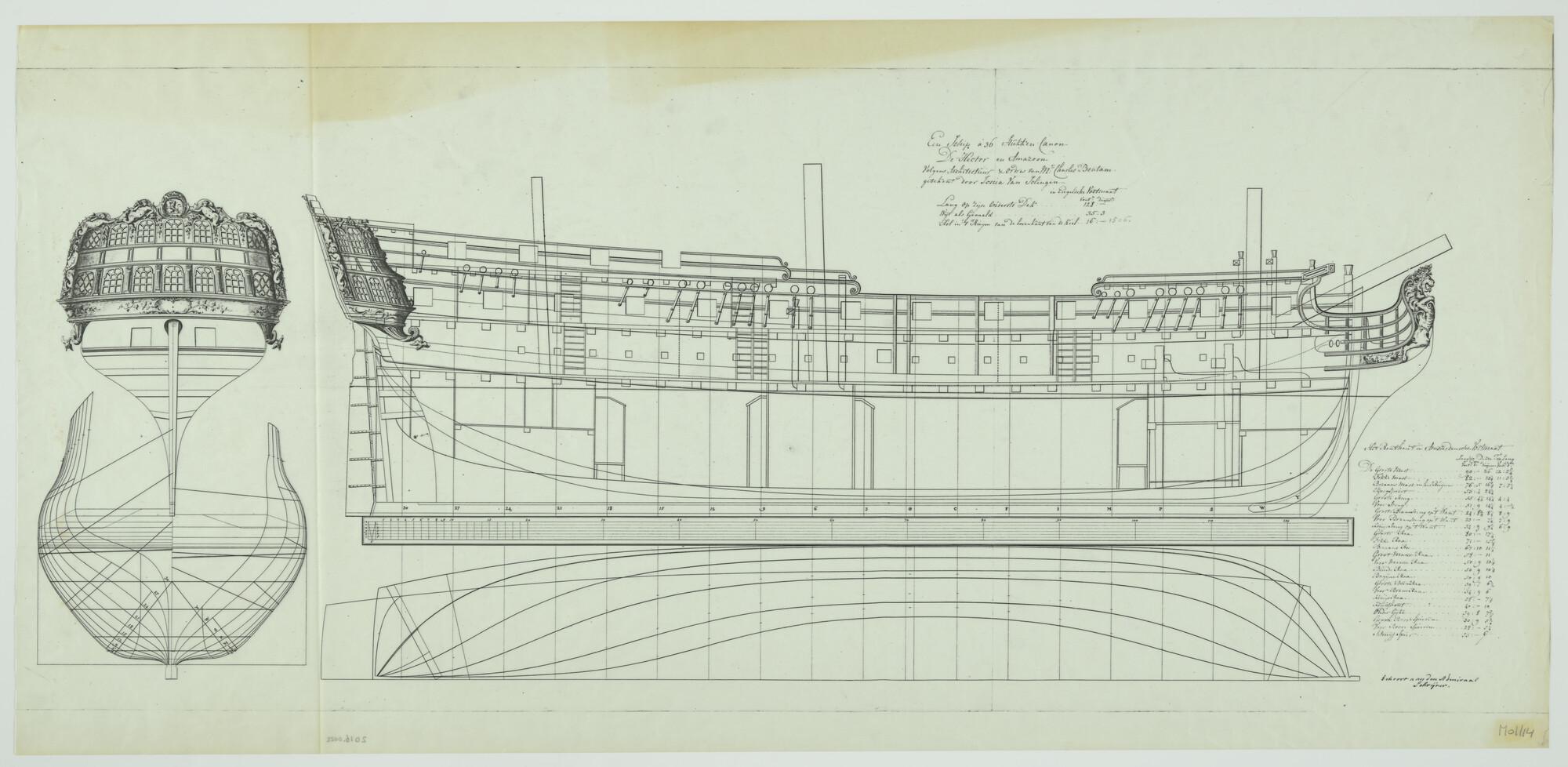 Lijnenplan en spantenraam van 's Lands schip van oor...
