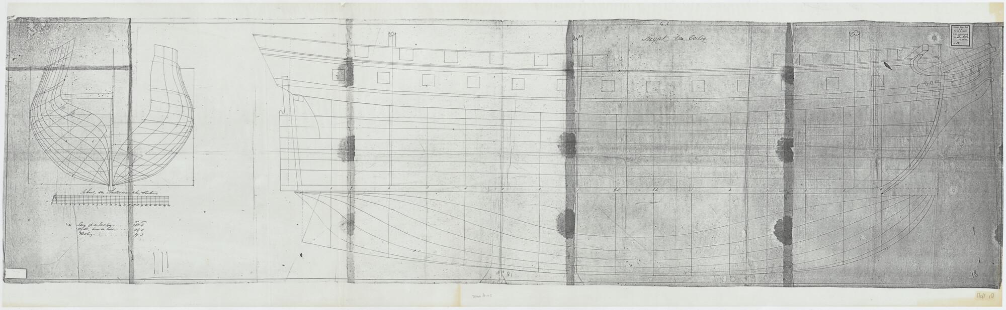 Lijnenplan, spantenraam en zijaanzicht van het frega...