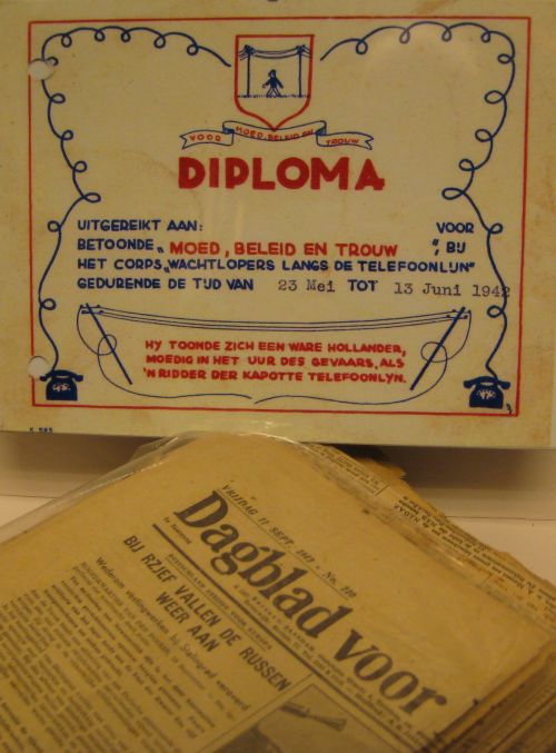 Oorlogskranten en diploma telefoonlijnbewaker