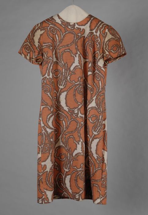 Oranje maxi-jurk met bruine en oranje vlakken op lijf