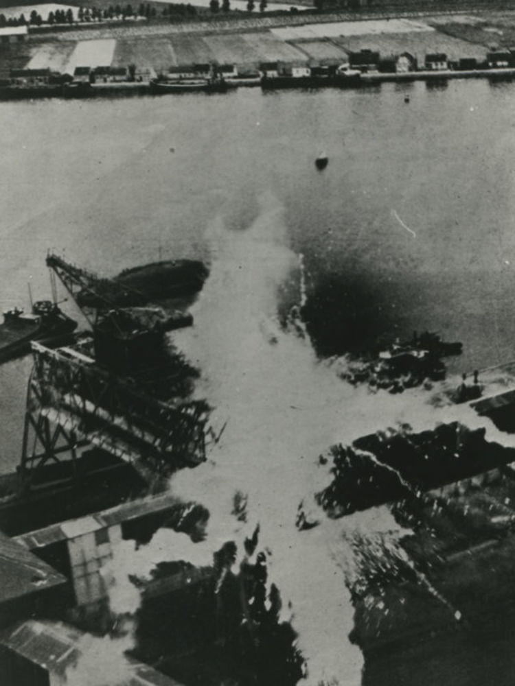 Foto van exploderende fosforbom boven scheepswerf. T...
