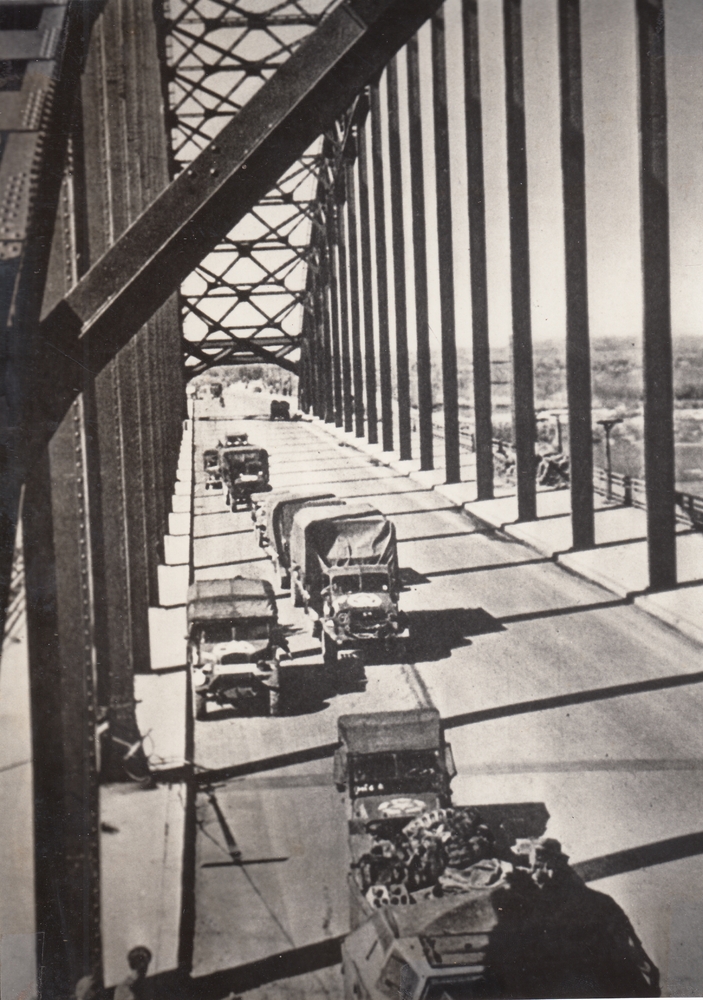 Foto van de Waalbrug bij Nijmegen met Engelse voertu...