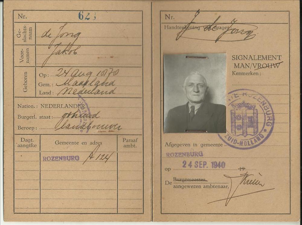Identiteitsbewijs Jacob de Jong geboren op 24 august...