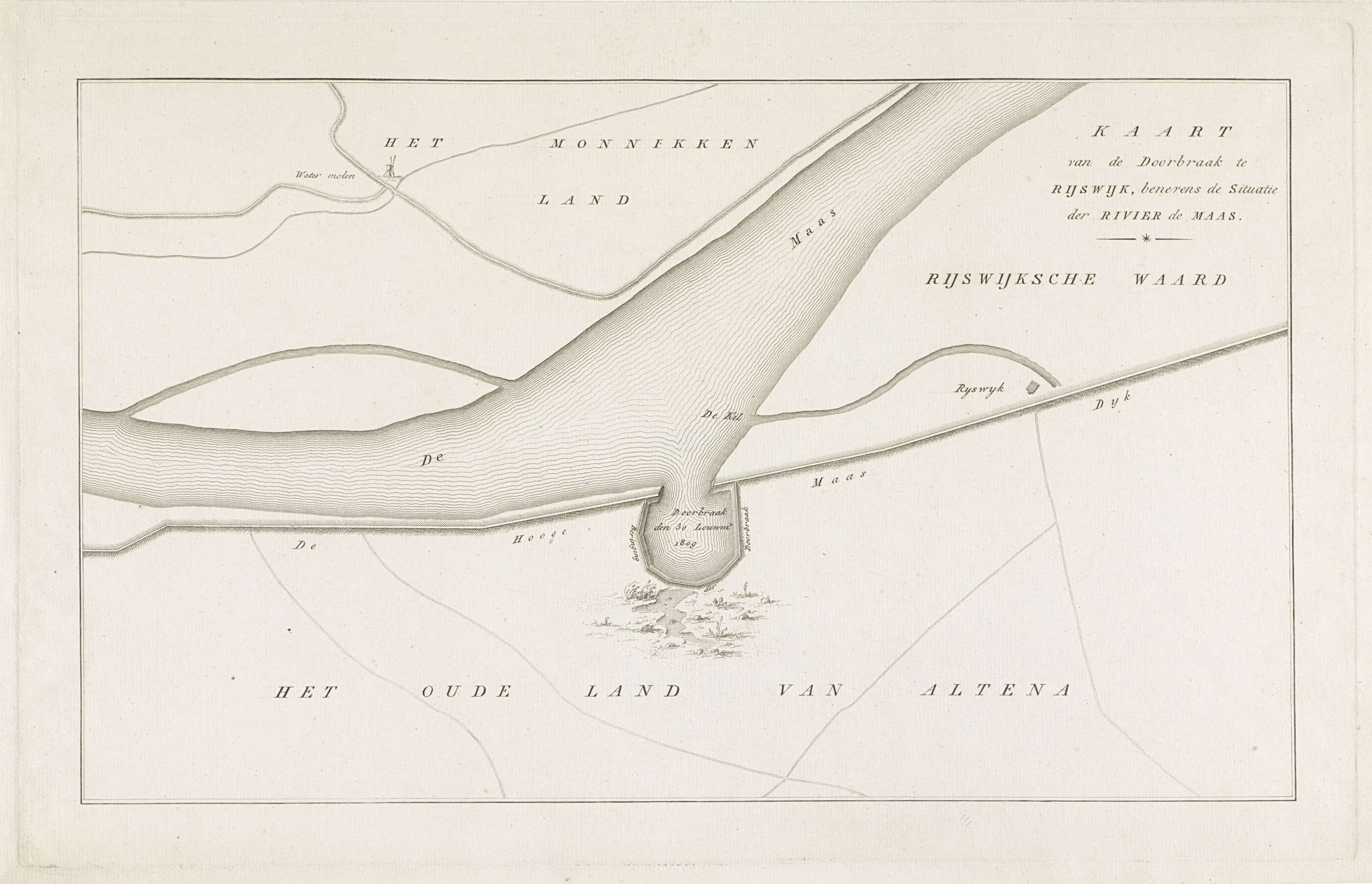 Kaart van dijkdoorbraak te Rijswijk, 1809