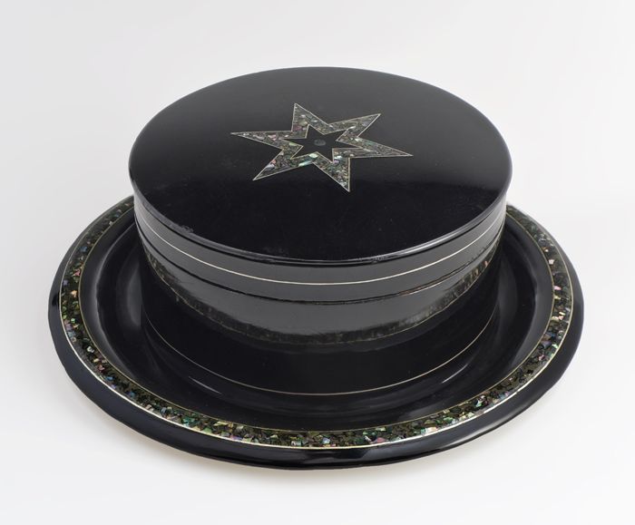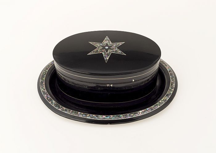Gelakte koektrommel met ingelegd parelmoeren sterpat...