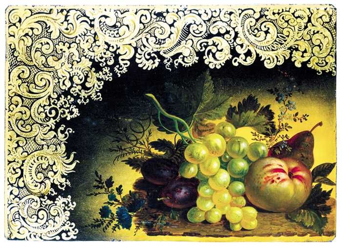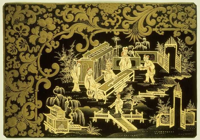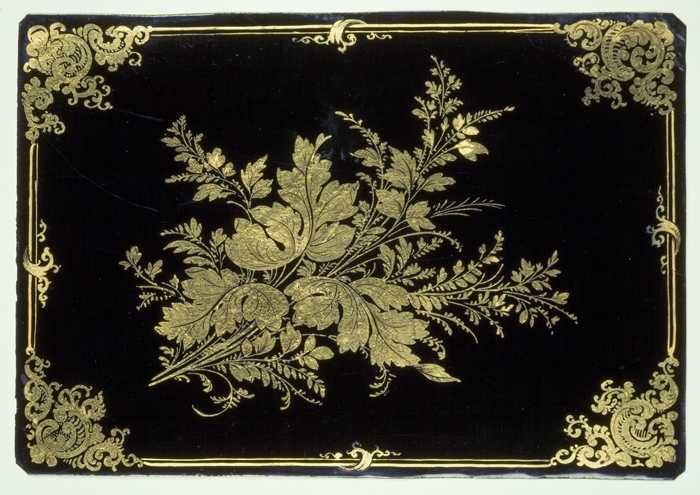 Metalen plaatje, gelakt in kleuren en goud op zwart,...