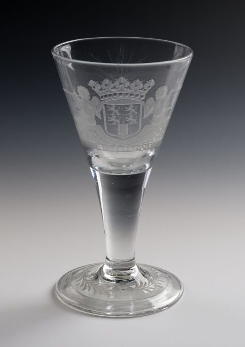 Kelkglas, gegraveerd met stadswapen van Rotterdam, "...