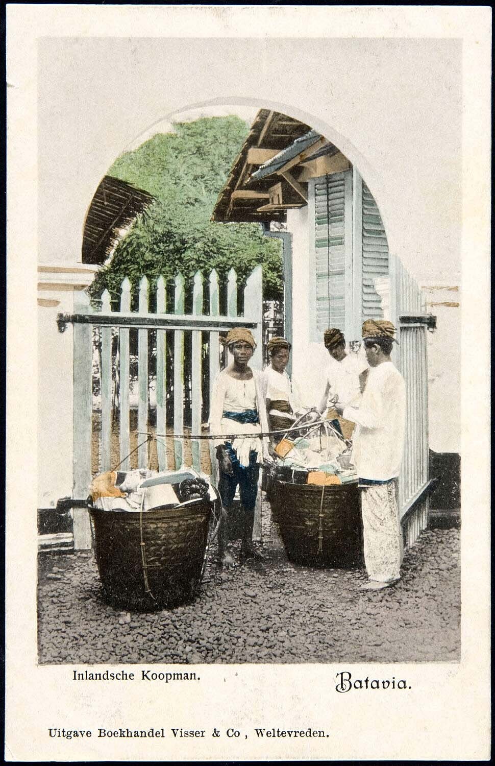 Een koopman die met zijn handel langs de huizen gaat