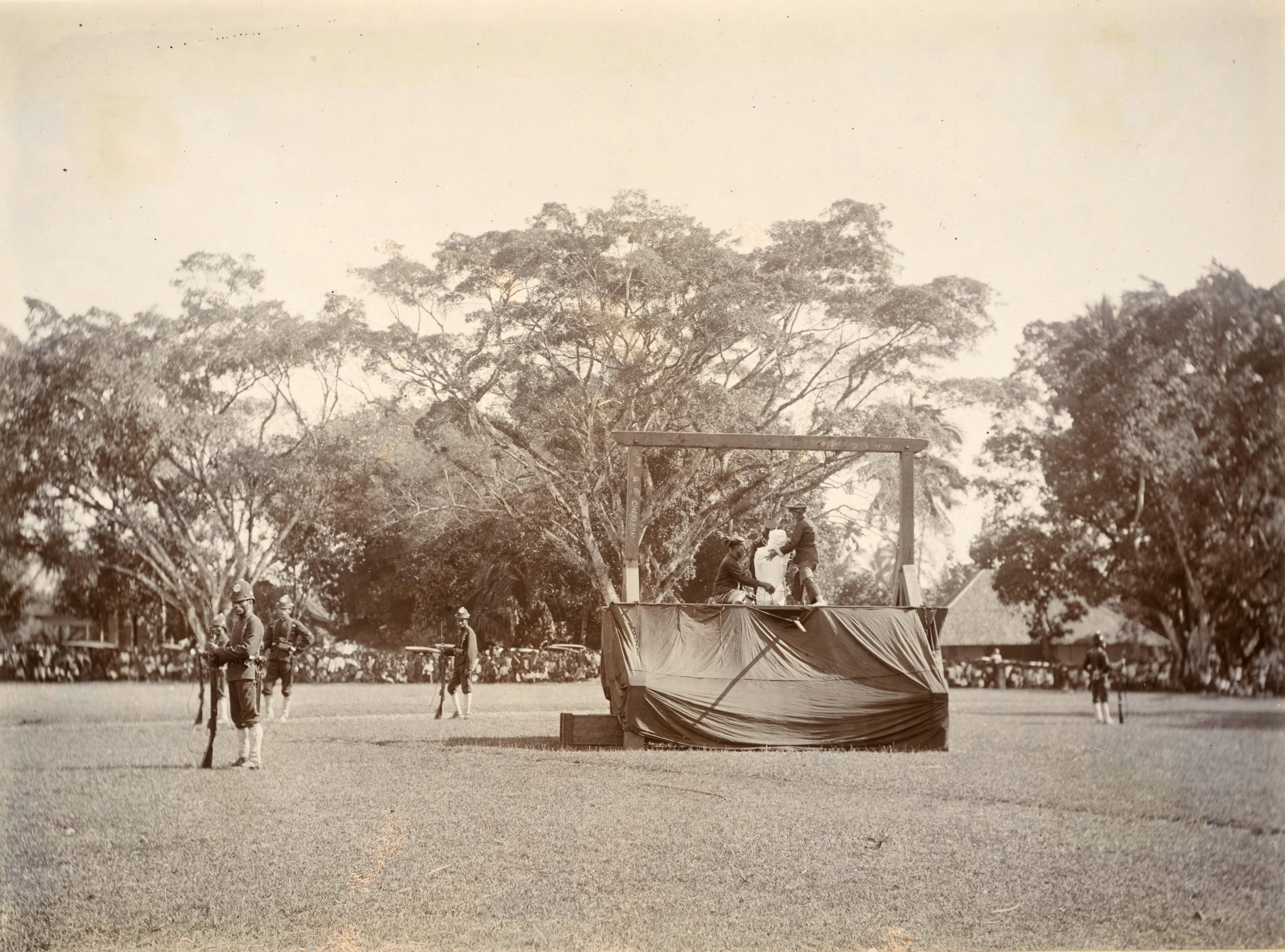 Het schavot met de galg waaraan een op 31 maart 1903...